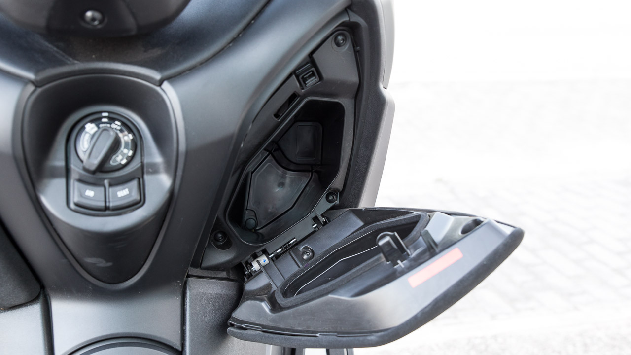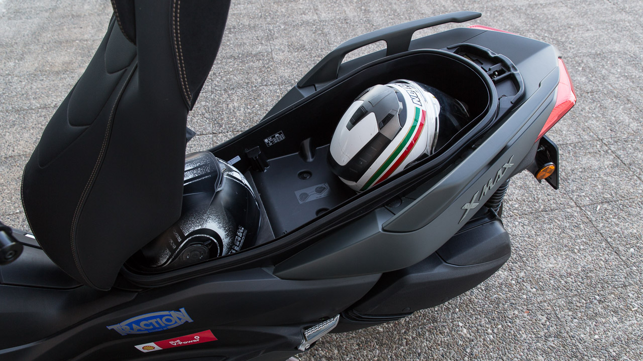 Η πρώτη γενιά του XMAX ήταν ένα από τα πρώτα μοντέλα αυτής της κατηγορίας που μπορούσε να φιλοξενήσει με άνεση δύο κράνη κλειστού τύπου κάτω από τη σέλα του και αυτό το χαρακτηριστικό το έκανε να ξεχωρίζει από τον ανταγωνισμό. Το XMAX 300 ακολουθεί πιστά στο δρόμο των προγόνων του και κάτω από τη σέλα θα βρείτε ένα φωτιζόμενο χώρο για δύο full face κράνη με περιθώριο αποθήκευσης και μερικών ακόμη αντικειμένων. Επιπλέον χώρο θα βρείτε στα δύο ντουλαπάκια της ποδιάς, με το αριστερό να είναι και εκείνο που κλειδώνει μαζί με το τιμόνι το scooter. Στις μεταφορικές ικανότητες του μοντέλου της Yamaha συνεισφέρουν όπως είπαμε και οι χειρολαβές, ενώ αν χρειάζεστε έξτρα αποθηκευτικούς χώρους στον κατάλογο των επίσημων αξεσουάρ θα βρείτε και κεντρική βαλίτσα.