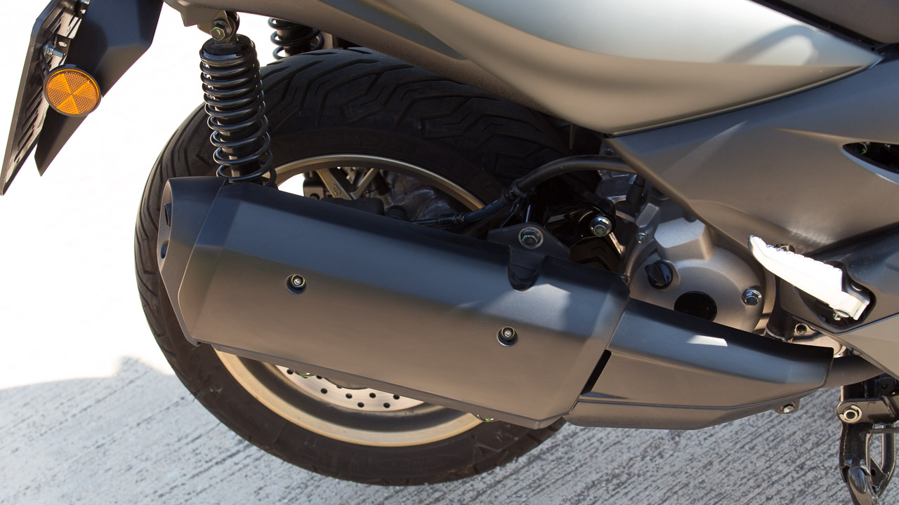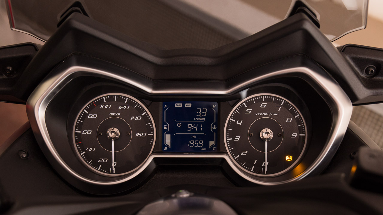 Το τιμόνι βρίσκεται σε καλή απόσταση από τον κορμό του αναβάτη που “τοποθετείται” κάθετα στη σέλα με αποτέλεσμα να έχει και ένα πολύ καλό οπτικό πεδίο για την επιτήρηση του δρόμου. Μπόλικο χώρο για τα πόδια σας θα βρείτε και στην ποδιά που προσφέρει τη δυνατότητα για την τοποθέτηση τους τόσο παράλληλα με το έδαφος όσο και πιο μπροστά και ψηλά, ένα από τα παραδοσιακά χαρακτηριστικά των GT scooters που σέβονται τον εαυτό τους. Ο πίνακας πληροφοριών χαρακτηρίζεται από τα αναλογικά και μεγάλα σε μέγεθος ταχύμετρο και στροφόμετρο, ενώ η LCD οθόνη στο κέντρο τους προσφέρει πολλές χρήσιμες πληροφορίες. Μεταξύ των πληροφοριών θα βρείτε τη μέση κατανάλωση, τη θερμοκρασία του περιβάλλοντος, τα χιλιόμετρα που έχετε διανύσει με τον ίδιο ιμάντα αλλά και το ίδιο λάδι! Οι ενδείξεις της οθόνης είναι ευανάγνωστες και μπορούν να αλλάξουν από σχετικό χειριστήριο στο δεξί γκριπ.