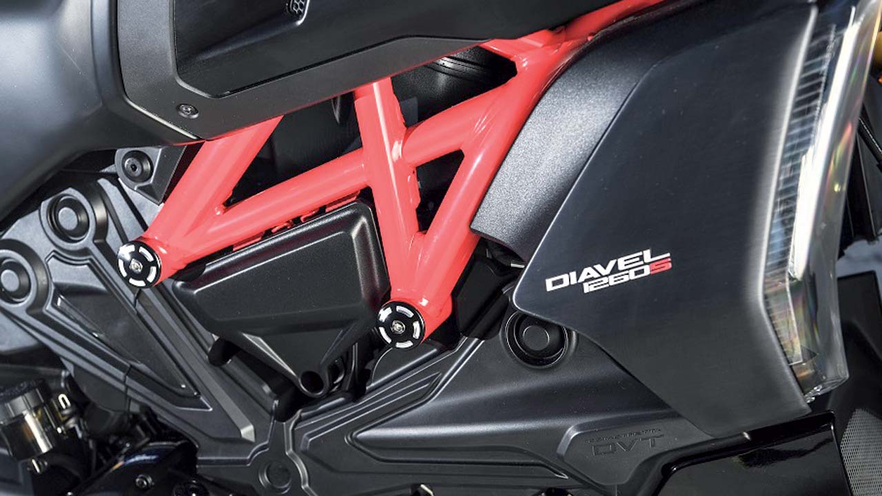 Το πλαίσιο χωροδικτύωμα αποτελεί status για την Ducati κι ακόμη περισσότερο για την Diavel. Με νέα σχεδίαση και πάντα σε κοινή θέα, συνδυάζει την εφαρμογή του σε ατσάλι με το θηριώδες αλουμινένιο ψαλίδι.