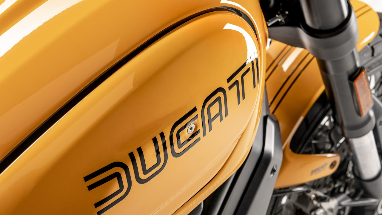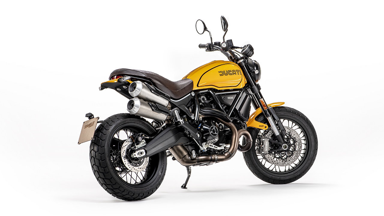Η αναφορά στον κόσμο των Motard μοτοσυκλετών είναι ξεκάθαρη στην επιλογή στοιχείων όπως οι τροχοί των 17 ιντσών με τις ακτίνες, το ψηλό εμπρός φτερό, η επίπεδη σέλα και οι πλαϊνές πινακίδες, που είναι τέλεια ενσωματωμένες στο σχέδιο της Ducati Scrambler.