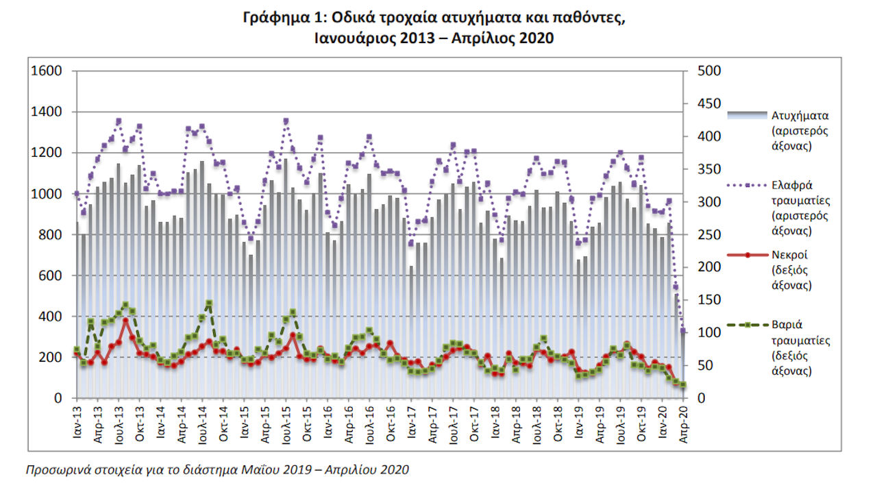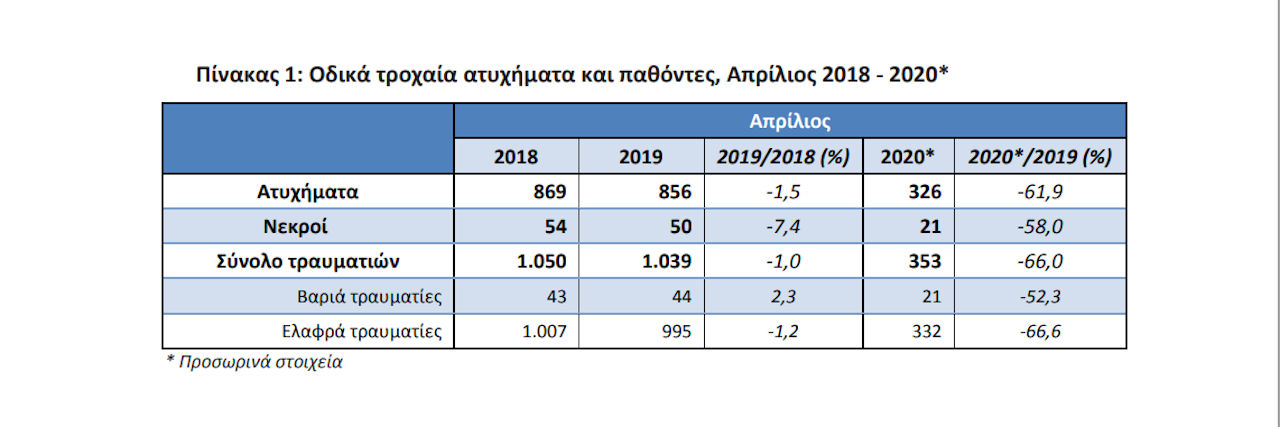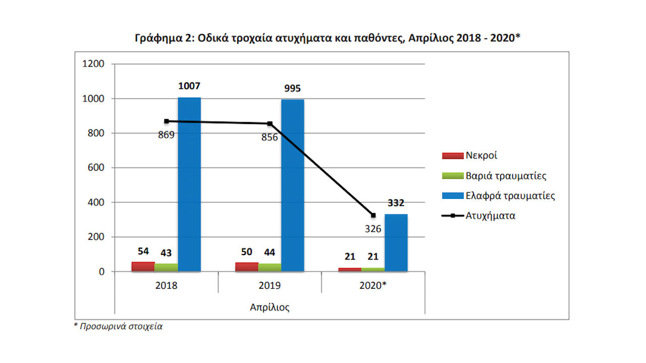 Από τα παθόντα πρόσωπα των οδικών τροχαίων ατυχημάτων του περασμένου Απριλίου, καταγράφηκαν 21 νεκροί, 21 βαριά τραυματίες και 332 ελαφρά τραυματίες, έναντι 50 νεκρών, 44 βαριά τραυματιών και 995 ελαφρά τραυματιών τον Απρίλιο του 2019. Η μείωση ανέρχεται στο 58% σε νεκρούς, στο 52,3% σε βαριά τραυματίες και 66,6% σε ελαφρά τραυματίες.