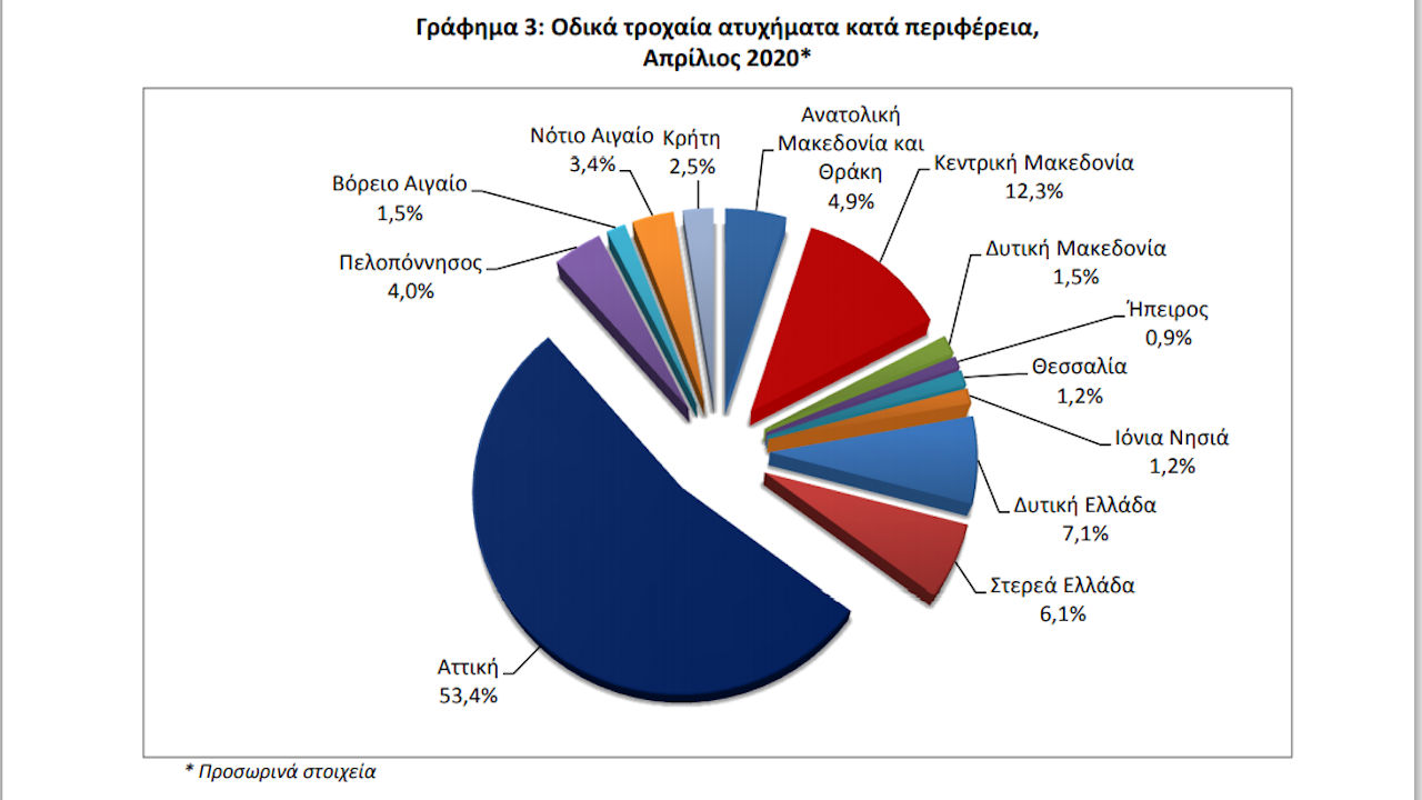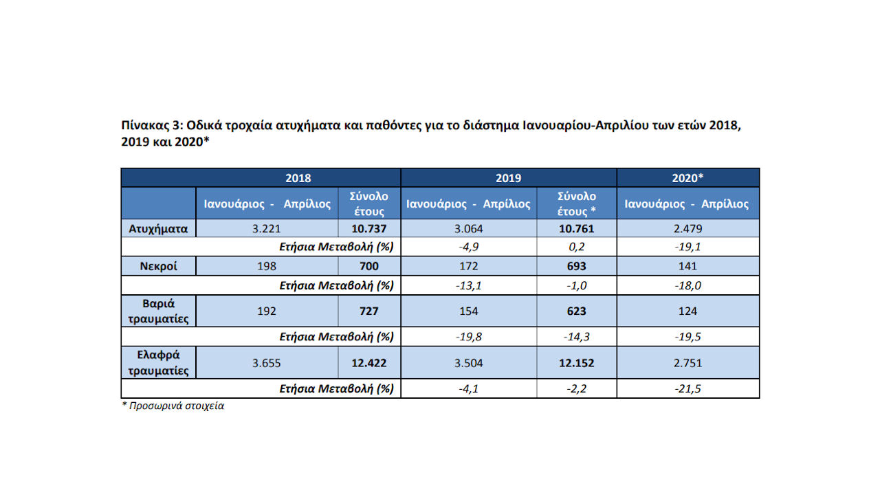 Τέλος, το πρώτο 4μηνο του 2020, σημειώθηκε πτώση στα συνολικά ατυχήματα κατά 19,1% έναντι της ίδιας περιόδου του 2019. Αναφορικά με τους νεκρούς η πτώση φτάνει στο 18% στη σύγκριση των δύο 4μήνων, για τους βαριά τραυματίες στο -19,5% και για τους ελαφριά στο -21,5%.