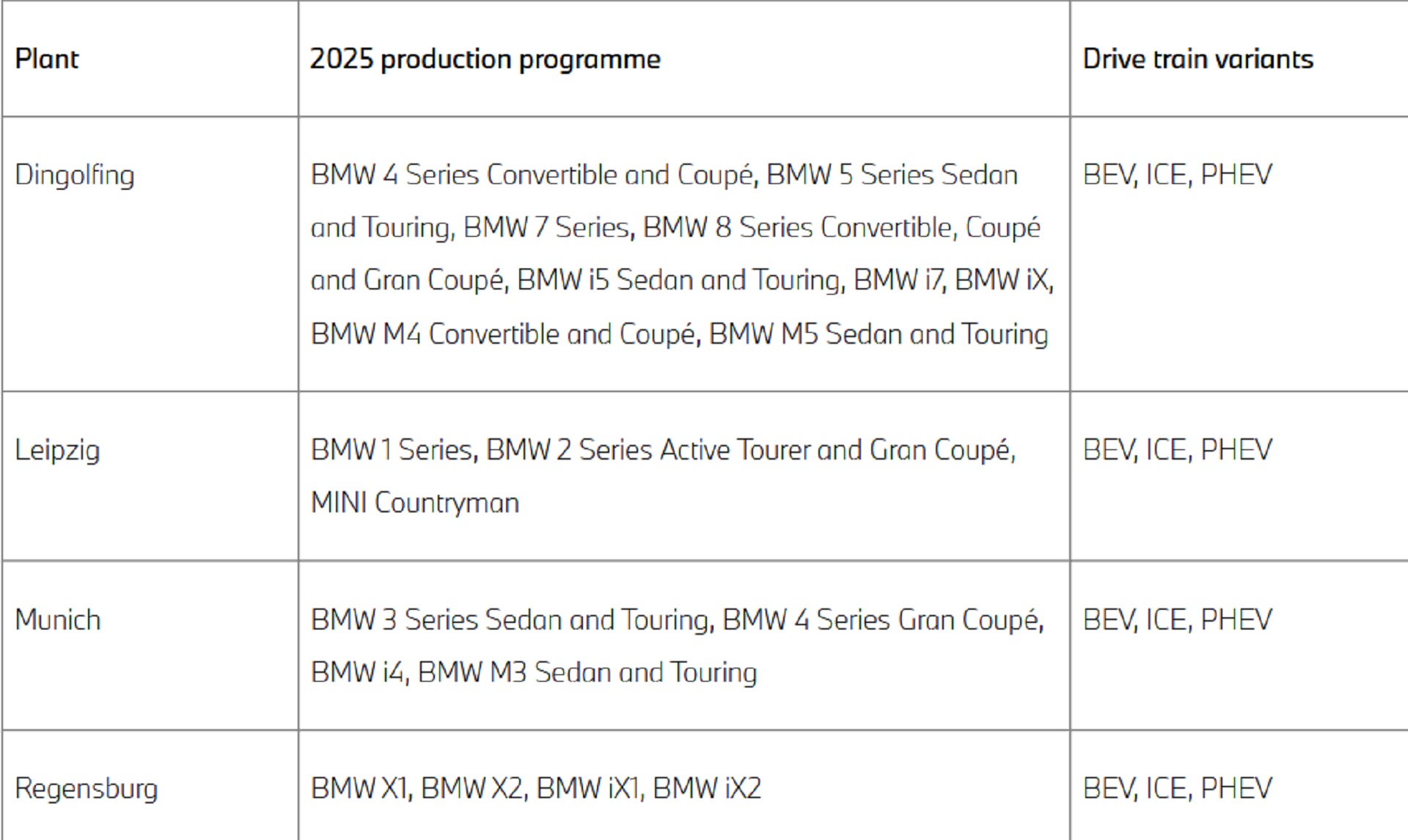 Σε όλα τα γερμανικά εργοστάσια, οχήματα με κινητήρες εσωτερικής καύσης, plug-in υβριδικά και πλήρως ηλεκτρικά συστήματα κίνησης παράγονται σε μία μόνο γραμμή. Με αυτήν την ευέλικτη δομή, η παραγωγή του BMW Group μπορεί να ανταποκρίνεται με ευέλικτο τρόπο στις διακυμάνσεις της ζήτησης και στις μεταβαλλόμενες συνθήκες της αγοράς. Επομένως, αποτελεί έναν σημαντικό πυλώνα που υποστηρίζει την ανθεκτικότητα της εταιρείας σε διαλειτουργικές δραστηριότητες και ένα βασικό ανταγωνιστικό πλεονέκτημα σε έναν δυναμικά εξελισσόμενο κλάδο.