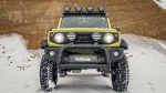 Ο λόγος για το εικονιζόμενο Suzuki Jimny, ένα αποτέλεσμα της συνεργασίας των εταιρειών Delta 4×4 και Avus Auto. Όπως μπορείτε να δείτε, στο εμπρός τμήμα έχουν τοποθετηθεί μεγάλοι προβολείς και bull-bar (μεταλλικό προστατευτικό), ενώ διευρυμένοι είναι και οι θόλοι του αμαξώματος. Προβολείς υπάρχουν και στην οροφή καθώς επίσης και μία σχάρα αποθήκευσης.
