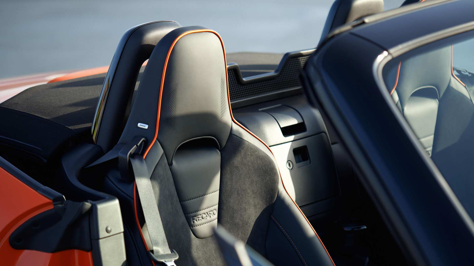 Αλλαγές υπάρχουν φυσικά και στο εσωτερικό του επετειακού Mazda MX-5, το οποίο έχει να επιδείξει Recaro μπάκετ καθίσματα με πορτοκαλί περίγραμμα, πορτοκαλί λεπτομέρειες σε αεραγωγούς και πάνελ θυρών και πορτοκαλί ραφές στο δερμάτινο τιμόνι, στον επιλογέα ταχυτήτων και στο χειρόφρενο.