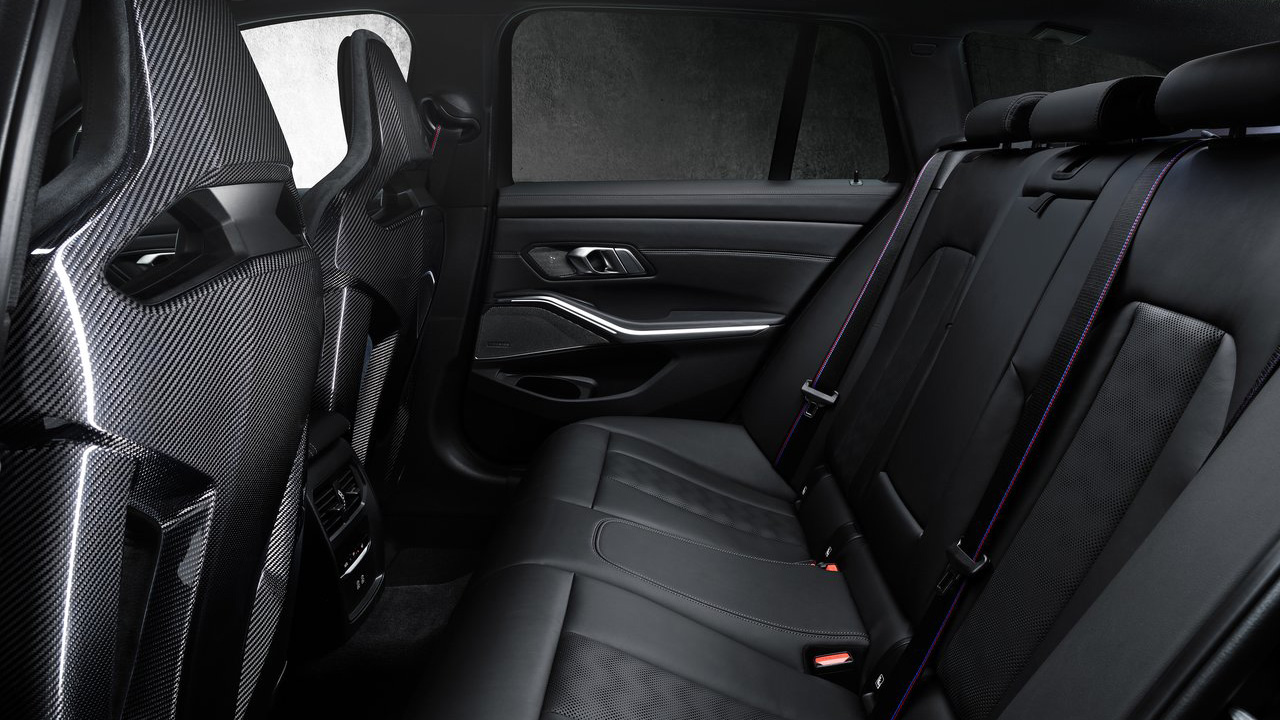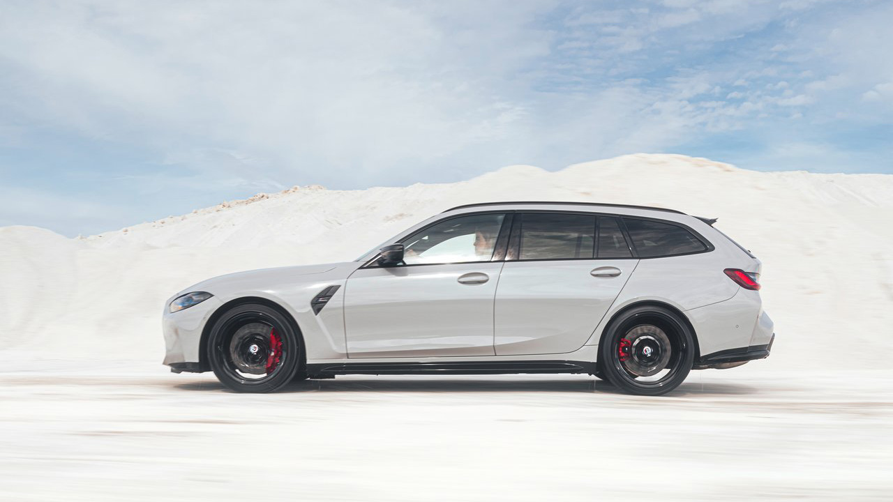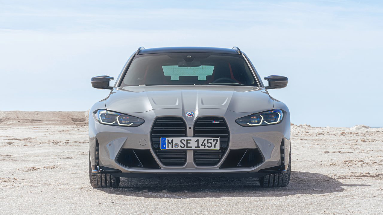 Πριν την δούμε τα σημεία που διαφέρει συγκριτικά με την sedan έκδοση αμαξώματος, αξίζει να αναφέρουμε ότι αφενός είναι ήδη το ταχύτερο station wagon στο Nurburgring και το απέδειξε πρόσφατα (δείτε εδώ το video) και αφετέρου προσφέρεται αποκλειστικά ως τετρακίνητο. Εξωτερικά, βλέπουμε στο εμπρός τμήμα τη γνωστή μάσκα, τριγύρω πολλές carbon λεπτομέρειες και πίσω τον διαχύτη με τις δύο διπλές απολήξεις. Αξιοσημείωτη προθήκη είναι οι ράγες οροφής, που ασφαλώς δεν τις συναντάμε στην sedan έκδοση, πόσο μάλλον στην M4, αλλά και οι σφυρήλατες ζάντες μεγέθους 19 ιντσών εμπρός και 20 πίσω.
