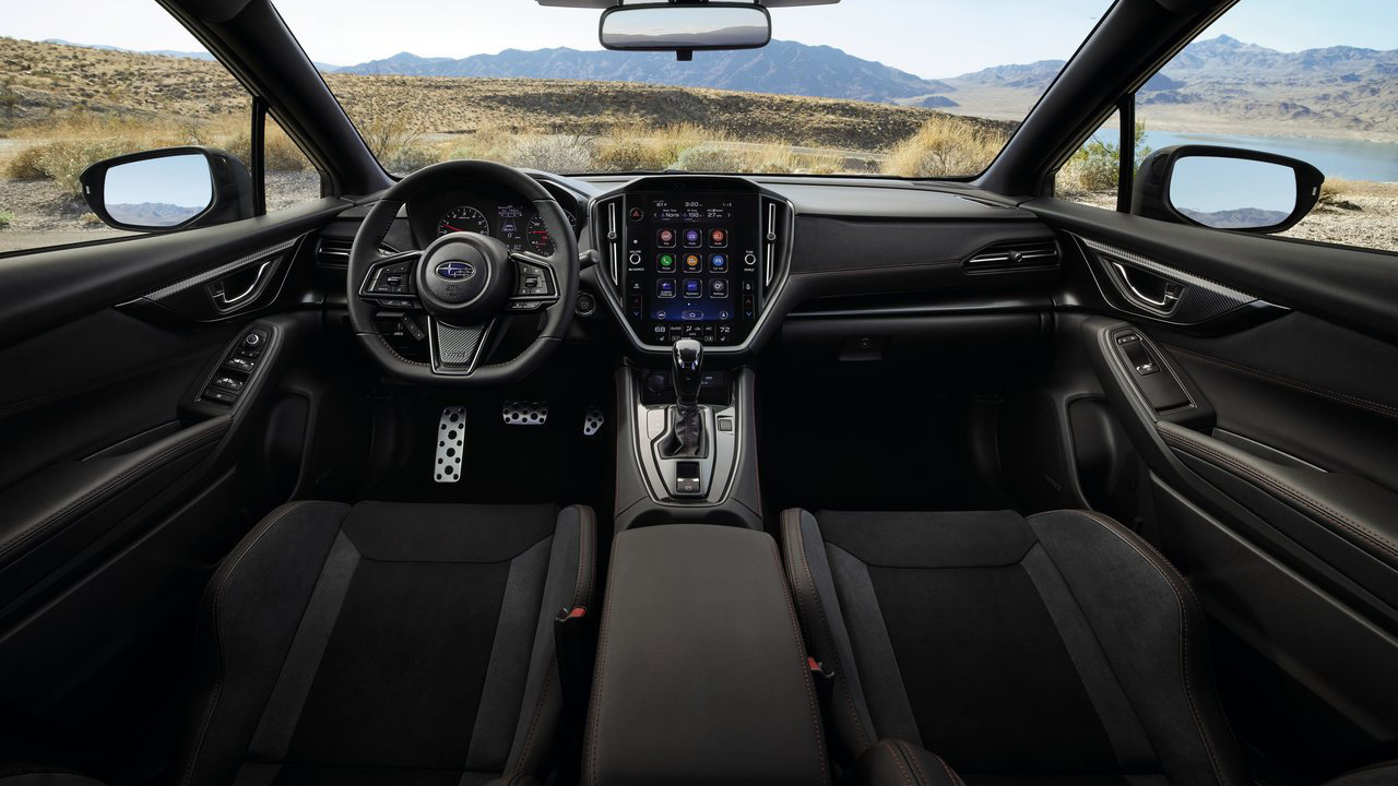 Περνώντας στο εσωτερικό του ιαπωνικού μοντέλου, στην κεντρική κονσόλα διακρίνεται η μεγάλη ψηφιακή οθόνη αφής μεγέθους 11,6 ιντσών, η οποία είναι κάθετα τοποθετημένη. Η “sportive” αίσθηση δημιουργείται με το επίπεδο κάτω μέρος του τιμονιού, τα αλουμινένια πεντάλ και τις κόκκινες ραφές στα καθίσματα με έντονη πλευρική στήριξη, ενώ τα λογότυπα WRX δεν θα μπορούσαν να απουσιάζουν. Κάπου εδώ, αξίζει να αναφέρουμε ότι υπάρχει διαθέσιμη επιλογή ηχοσυστήματος Harman Kardon με 11 ηχεία.