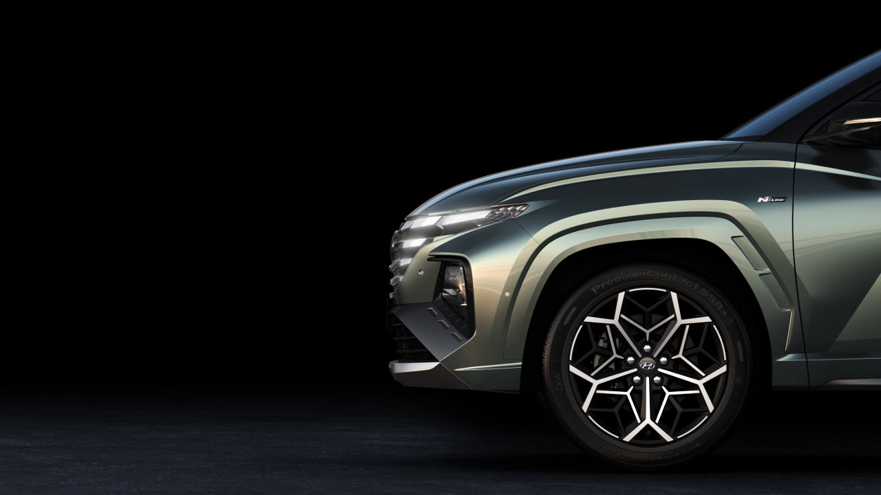 Με το σχήμα του νέου Tucson να παρουσιάζεται ήδη ιδιαίτερα δυναμικό οι αισθητικής φύσεως αλλαγές στην έκδοση N Line περιορίζονται στο εμπρός μέρος στα άκρα του προφυλακτήρα και στο κάτω μέρος του με το πιο τονισμένο “χείλος”.