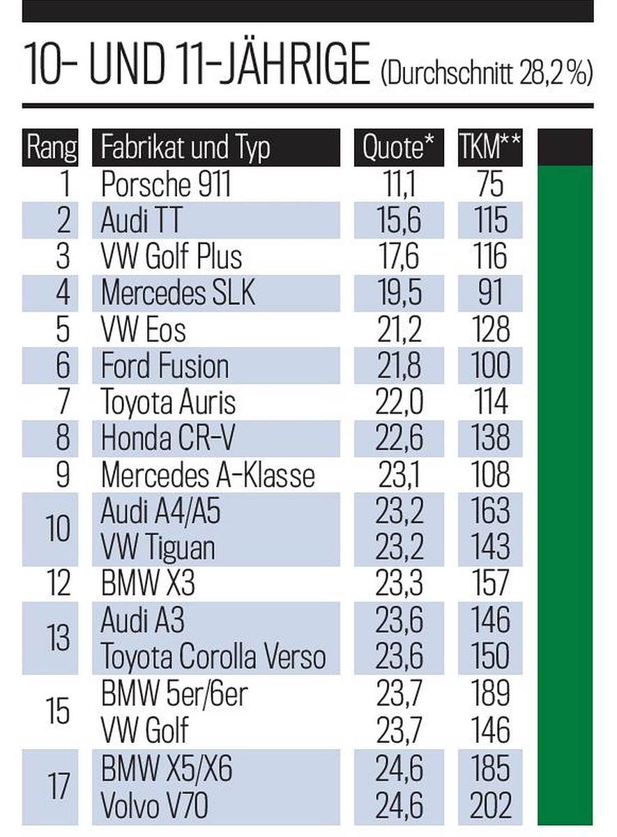 Στην κατηγορία αυτοκινήτων ηλικίας 10-11 ετών, βλέπουμε πως στην πρώτη θέση της κατάταξης με τα πιο αξιόπιστα αυτοκίνητα είναι η Porsche 911, ενώ ακολουθείται από το Audi TT. Τρίτο πιο αξιόπιστο αυτοκίνητο είναι το VW Golf Plus, τέταρτο η Mercedes SLK και πέμπτο το VW Eos. Στην έκτη θέση βρίσκεται το Ford Fusion, στην έβδομη το Toyota Auris, στην όγδοη το Honda CR-V, στην ένατη η Mercedes A-Class και την δεκάδα κλείνουν με ισοβαθμία τα Audi A4/A5 και VW Tiguan.