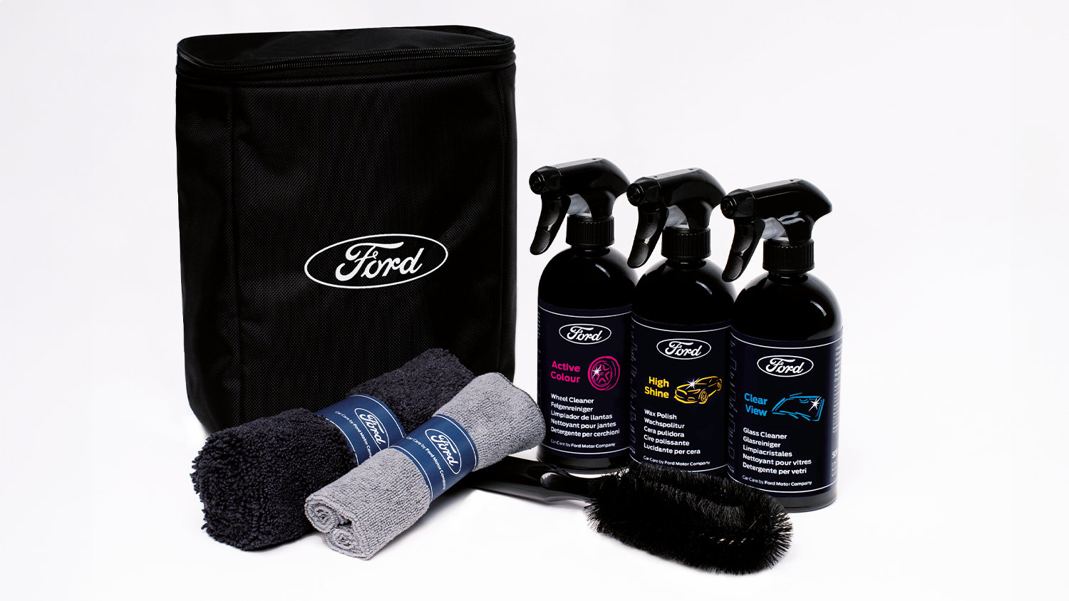 Το αντίστοιχο κιτ καθαρισμού εξωτερικών επιφανειών περιλαμβάνει το γυαλιστικό κεριού High Shine, το καθαριστικό τζαμιών Clear View καθώς και το καθαριστικό Active Colour για τις ζάντες του αυτοκινήτου. Συσκευασμένο σε μια εκλεπτυσμένη μαύρη τσάντα με το σήμα της Ford, το κιτ περιλαμβάνει επίσης ένα γκρι βελουτέ πανί μικροϊνών, ένα μαύρο πανί μικροϊνών και μία ειδική βούρτσα καθαρισμού τροχών, αποτελώντας την επιτομή της φροντίδας για κάθε μοντέλο Ford και όσους αναζητούν απαράμιλλη ποιότητα.