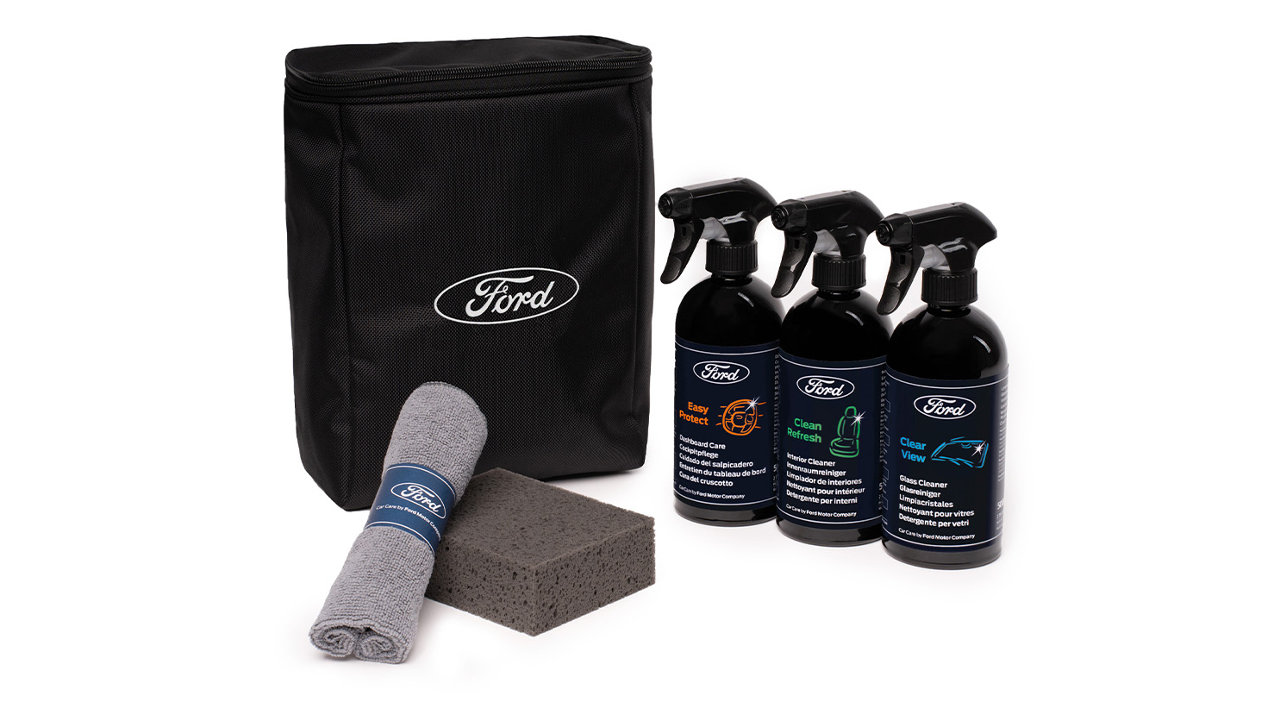 Το κιτ φροντίδας εσωτερικών χώρων περιλαμβάνει το καθαριστικό Ford Clean Refresh, το Easy Protect για τη φροντίδα του ταμπλό, καθώς και το καθαριστικό για τα τζάμια του οχήματος Clear View, εξασφαλίζοντας μια ολοκληρωμένη λύση καθαρισμού και προστασίας για κάθε εσωτερική επιφάνεια. Όλα διατίθενται μαζί με ένα βελουτέ πανί μικροϊνών και έναν σπόγγο, τακτοποιημένα σε μια πρακτική και κομψή μαύρη τσάντα Ford.