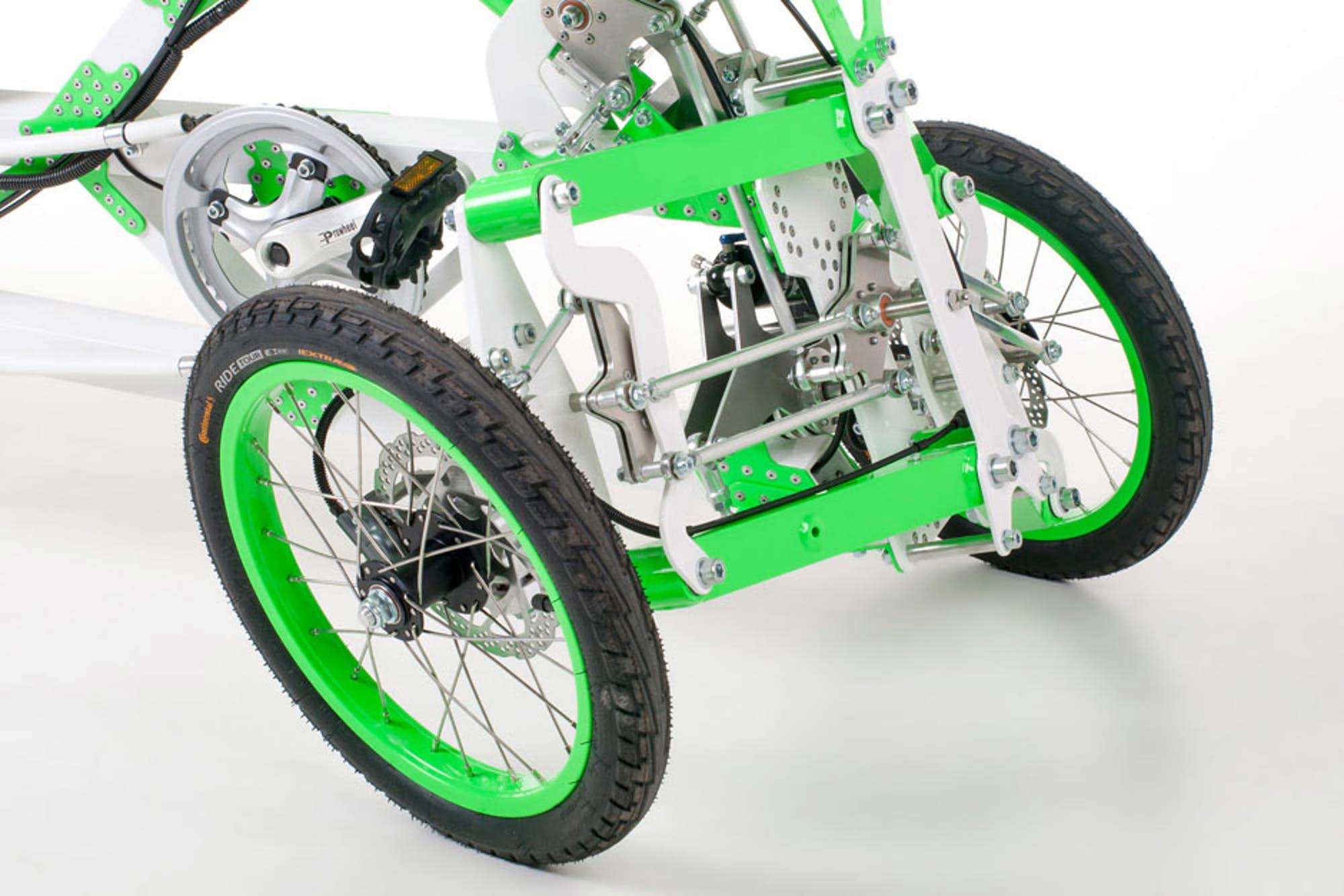 Ξεκίνησε με τέσσερις τροχούς, όμως στη νέα εκδοχή το EV4 χρησιμοποιεί πια τρεις, δημιουργώντας μια σταθερή τριγωνική βάση που εξαλείφει το άγχος της ισορροπίας και τον κίνδυνο της πτώσης. Οι δύο τροχοί των 16 ιντσών στο εμπρός μέρος συνδέονται με ένα σύστημα παράλληλων δοκών και αρθρώσεων, που επιτρέπουν στο όχημα να πάρει κλίσεις όταν στρίβει ανάλογες με εκείνες ενός οχήματος μονού ίχνους που ισορροπεί σε δύο τροχούς. Στο πίσω μέρος, ένας μεγαλύτερος σε διάμετρο τροχός, 20 ιντσών, συμπληρώνει την εικόνα και αναλαμβάνει και τη μετάδοση της κίνησης. Ο οδηγός τοποθετείται σε μια κάπως παράδοξη χαμηλή όσο και άνετη θέση, σε ένα bucket κάθισμα που τον στηρίζει καλά και περιορίζει τις κινήσεις του.