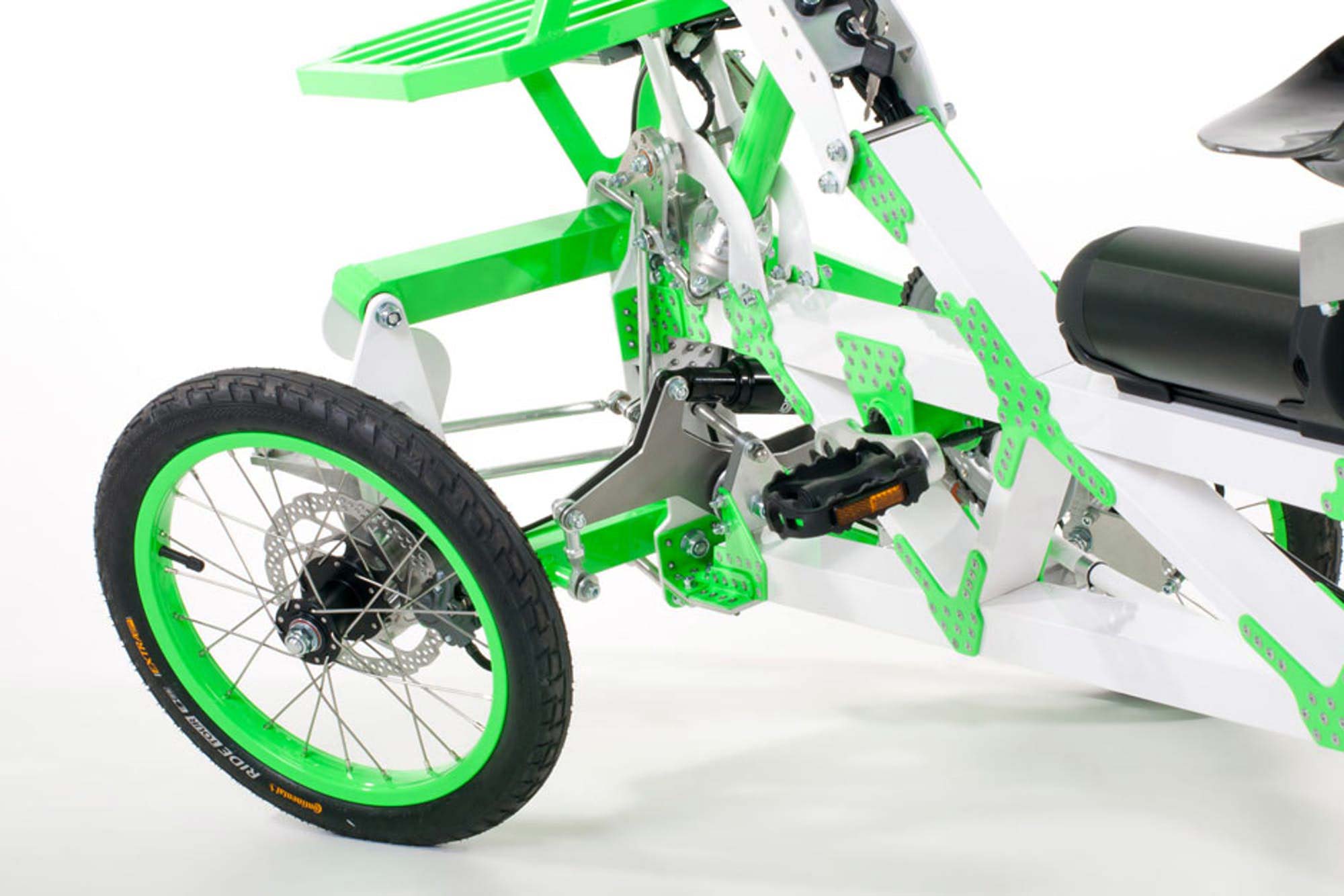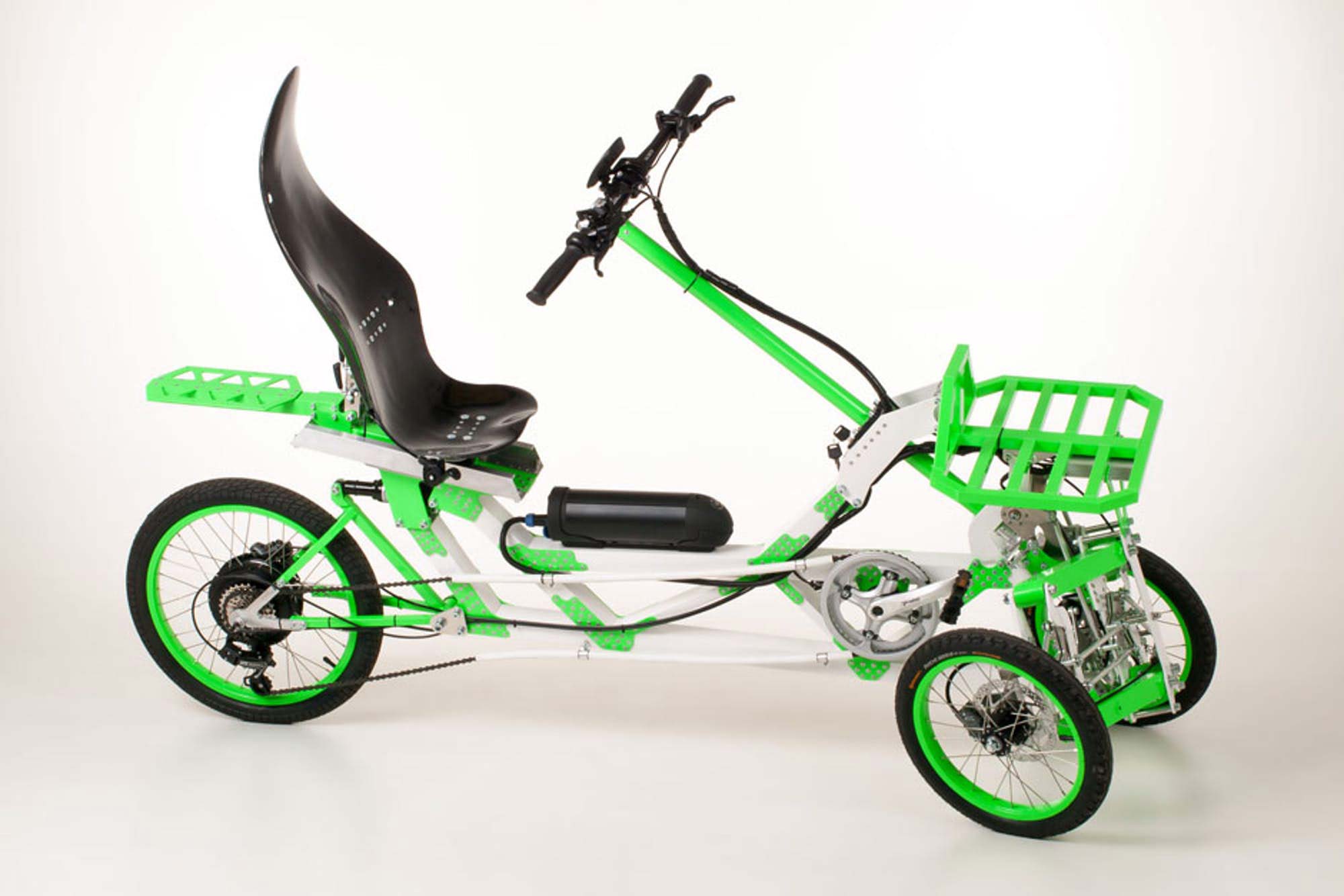 Οι σχάρες στο εμπρός και πίσω μέρος προσφέρουν μεγάλες δυνατότητες μεταφοράς, που φτάνουν τα 20 κιλά για την μπροστινή μόνο! Καθώς γέρνουν βέβαια μαζί με το όχημα, θα χρειαστεί να είναι και ανάλογα καλά δεμένες. Η μετάδοση περιλαμβάνει σασμάν επτά σχέσεων της Shimano gears, ενώ υδραυλικές αναρτήσεις φροντίζουν την επαφή των τροχών με τον δρόμο και την άνεση του οδηγού. Το EV4 προσφέρεται κατά παραγγελία, που όμως θα χρειαστεί δύο μήνες αναμονής για να εκτελεστεί και 3.976 δολάρια για να ξεκινήσει. Όμως μετά, όπου κι αν κινηθεί, είναι βέβαιο ότι θα τραβήξει τα βλέμματα, δημιουργώντας απορίες όσο και θαυμασμό…