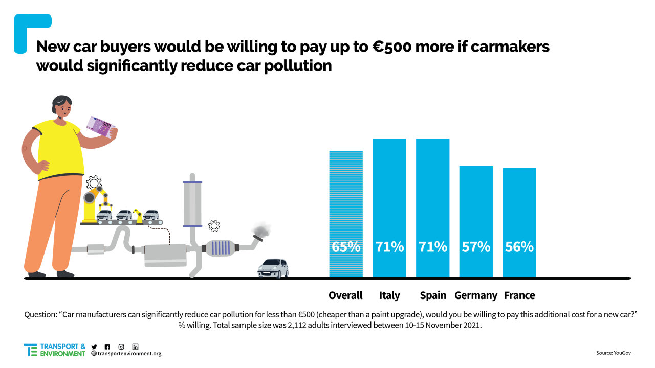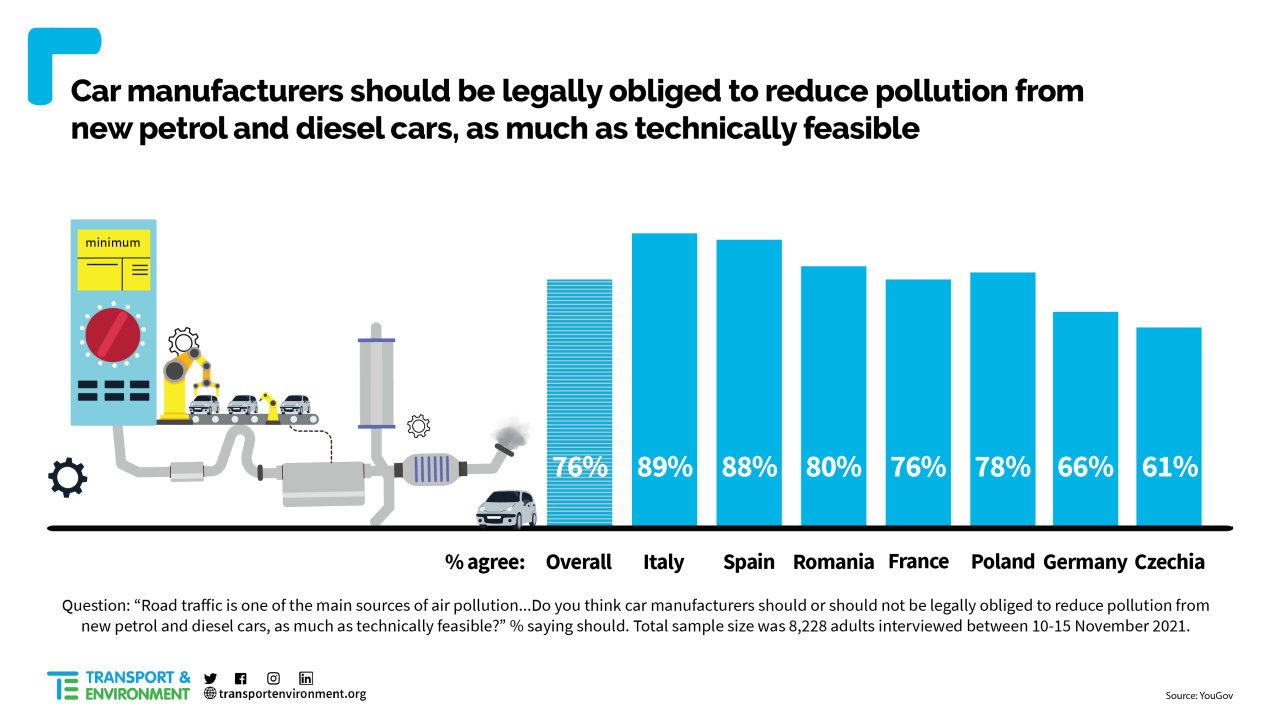 Στην έρευνα που έλαβε μέρος σε επτά χώρες της Ε.Ε. (Γερμανία, Γαλλία, Ιταλία, Ισπανία, Πολωνία, Ρουμανία και Τσεχία) και συμμετείχαν περισσότεροι από 8.000 πολίτες, το 76% των ερωτηθέντων δήλωσε σε σχετική ερώτηση πως οι κατασκευαστές θα πρέπει να υποχρεωθούν από το νόμο να μειώσουν όσο το δυνατό περισσότερο τις εκπομπές ρύπων που προέρχονται από τα καινούρια αυτοκίνητα, σε τεχνικό επίπεδο.