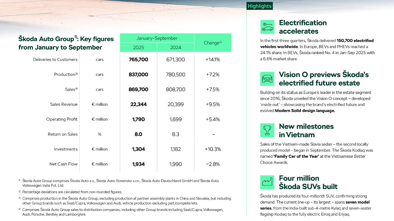 Ιδιαίτερα ισχυρή είναι και η διεθνής δραστηριότητα της μάρκας: στην Ινδία, η Skoda πέτυχε νέο ιστορικό ρεκόρ, με 49.400 παραδόσεις (+106,1%), ενώ ξεκίνησε παραγωγή και εμπορική διάθεση στο Βιετνάμ, ενισχύοντας ακόμη περισσότερο το παγκόσμιο αποτύπωμά της.