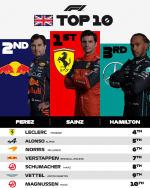 Τελικά η πρώτη δεκάδα συμπληρώθηκε με τους Norris, Verstappen, Schumacher, Vettel και Magnussen. Στις μη βαθμολογήσιμες θέσεις 11 ως 14 τερμάτισαν οι Stroll, Latifi, Ricciardo και Tsunoda, ενώ οι Ocon, Gasly, Bottas, Russell, Zhou και Albon δεν κατάφεραν να τερματίσουν. Μετά το τέλος του αγώνα ο Leclerc έσπευσε να συγχαρεί τον ομόσταυλό του και κατόπιν έφυγε προς τα pits, με τον Mattia Binotto να τρέχει να τον ηρεμήσει. Την ίδια ώρα ο Carlos Sainz έπλεε σε πελάγη ευτυχίας, μην μπορώντας ακόμη να συνειδητοποιήσει πως τα κατάφερε. Πριν καλά-καλά η πίστα του Silverstone κρυώσει, είχε ήδη πάρει φωτιά το Twitter, με τους tifosi να κατηγορούν τη Ferrari για τις επιλογές της και τη στρατηγική της, που για μία ακόμη φορά κατέστρεψε τον αγώνα του Charles Leclerc, του μόνου προς στιγμήν διεκδικητή του τίτλου για τους κόκκινους. Όσο για εμάς ανανεώνουμε το ραντεβού μας για την ερχόμενη εβδομάδα, που θα ταξιδέψουμε στην Αυστρία, πατρίδα της Red Bull για τον 11ο αγώνα της χρονιάς, σε έναν μήνα γεμάτο αγωνιστική δράση, καθώς έχει προγραμματισμένα 4 GP πριν το καλοκαιρινό διάλειμμα. Μείνετε συντονισμένοι…