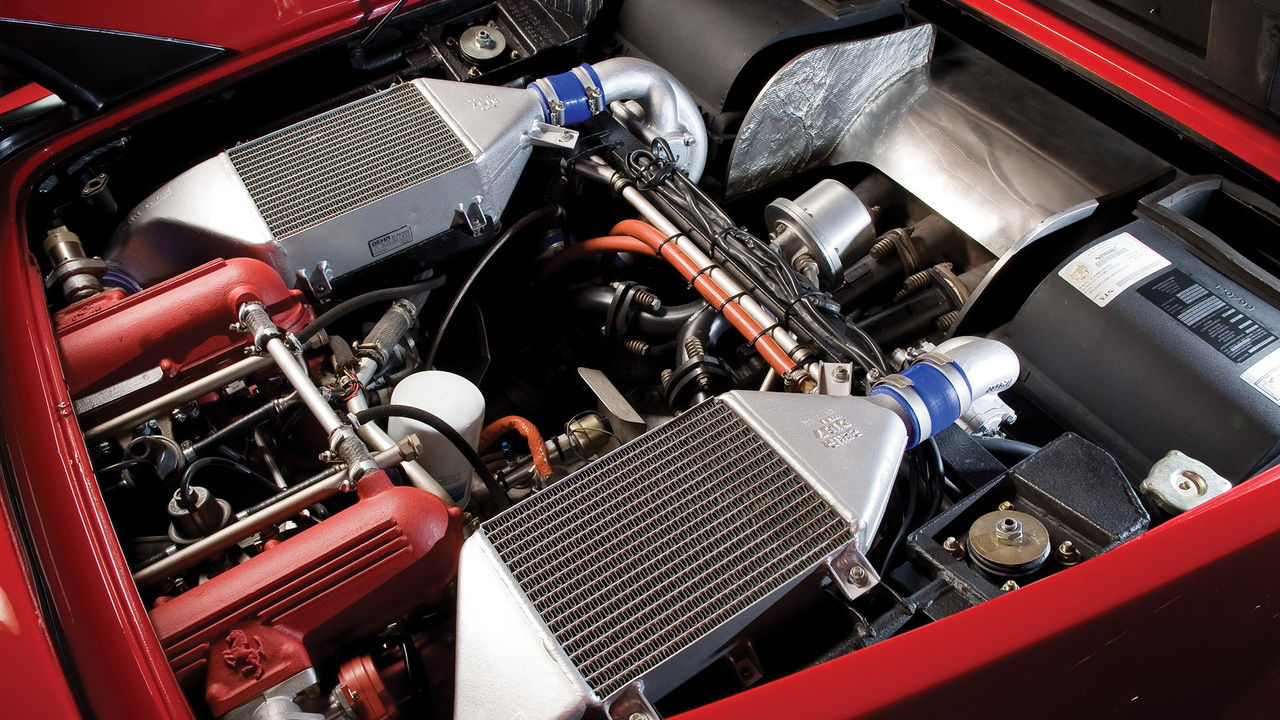 Με πολλή δουλειά και στα σωθικά του, ο ατμοσφαιρικός V8 των 2,9 λίτρων της GTB, μίκρυνε ελαφρώς σε χωρητικότητα για να συμμορφωθεί με τους κανονισμούς της FIA (από 2.927 κ.εκ. στα 2.855) και απέκτησε δύο υπερσυμπιεστές της ιαπωνικής IHI αλλά και υγρόψυκτα intecoolers. Το μοτέρ διατήρησε τη θέση του πίσω από τα καθίσματα, αλλά τοποθετήθηκε κατά τον διαμήκη άξονα και όχι εγκάρσια όπως στην 308, για να χωρέσουν με άνεση οι υπερσυμπιεστές και οι εναλλάκτες. Το μεταξόνιο αυξήθηκε κατά 110 χλστ. για να διατηρηθεί η σωστή κατανομή των βαρών μεταξύ των αξόνων αφού και το πεντατάχυτο κιβώτιο άλλαξε θέση και τοποθετήθηκε στο πίσω μέρος του μοτέρ ενώ αυξημένα ήταν και τα μετατρόχια.