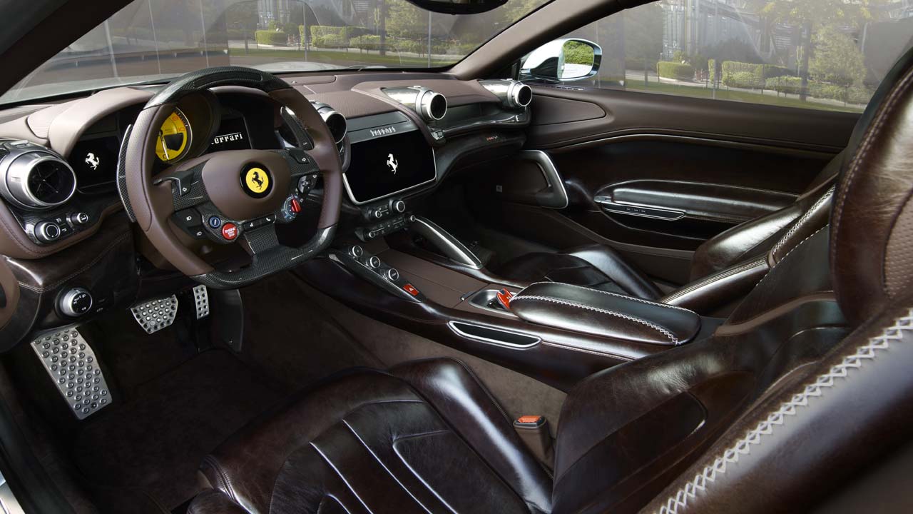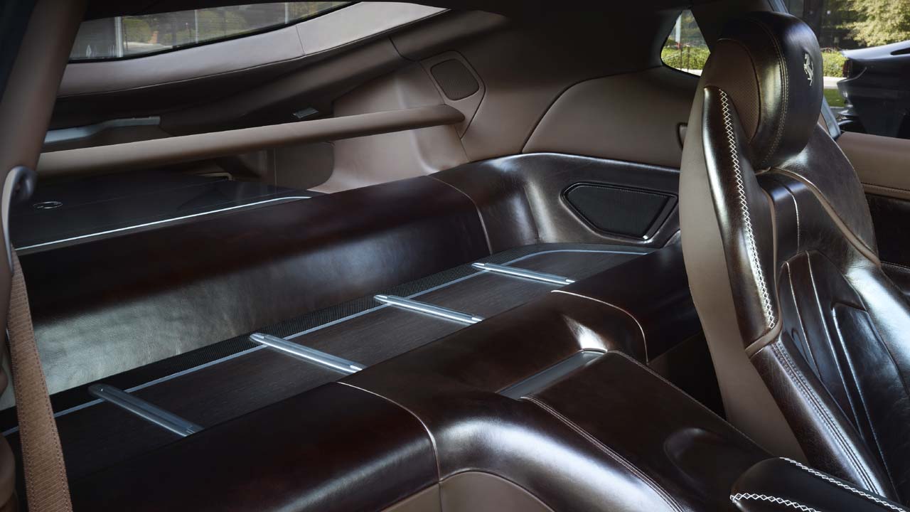 Το εσωτερικό της Ferrari BR20 είναι διακοσμημένο σε δύο αποχρώσεις καφέ δέρματος, ενώ τα ανθρακονήματα έχουν έντονη παρουσία. Η επένδυση από ξύλο βελανιδιάς με ένθετα από ανθρακονήματα κοσμεί τον πίσω πάγκο και τον χώρο αποσκευών.
