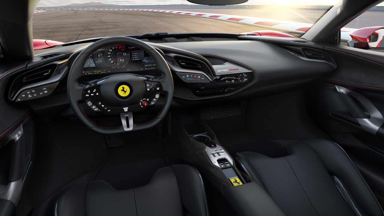 Και μετά από τις εικόνες του αμαξώματος περνάς στο εσωτερικό και δεν μπορείς παρά να ζηλέψεις τον τρόπο με τον οποίο οι σχεδιαστές έχουν ενσωματώσει οθόνες και πάνελ αφής σε μία άκρως οδηγοκεντρική καμπίνα. Ο πίνακας οργάνων είναι για πρώτη φορά σε Ferrari εξολοκλήρου ψηφιακός και έχει μέγεθος 16 ιντσών και 3D γραφικά. Ο οδηγός μπορεί να ελέγξει το 80% των λειτουργικών του αυτοκινήτου από το τιμόνι, ενώ υπάρχει και Head-Up display προκειμένου να μην πάρει το βλέμμα του ποτέ από τον δρόμο. Ακόμη ένα στοιχείο πάντως που προκαλεί εντύπωση είναι πως αν και απουσιάζει ο λεβιές ταχυτήτων από το κεντρικό τούνελ, ο σχεδιασμός των χειριστηρίων του κιβωτίου παραπέμπει στο κλασσικό “χτένι” των παλαιότερων Ferrari με χειροκίνητο κιβώτιο.