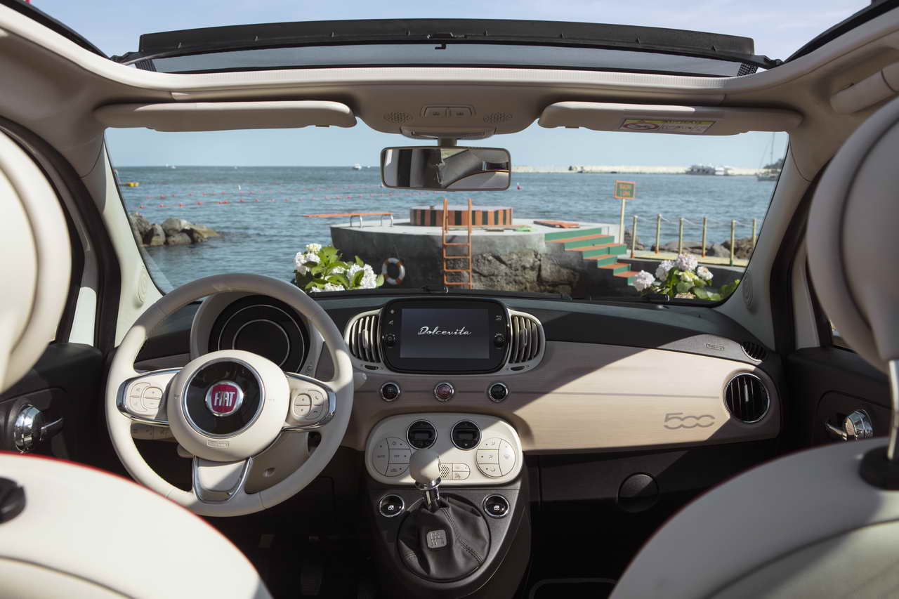 Η 3θυρη έκδοση του Fiat 500 Dolcevita παράγεται σε ειδικό χρωματισμό “Gelato White” με κόκκινες και λευκές λεπτομέρειες, που συμπληρώνονται από στοιχεία νίκελ. Οι λευκές ζάντες 16 ιντσών και η γυάλινη οροφή, διαμορφώνουν την πλήρη εικόνα. Από την άλλη, το Fiat 500 Dolcevita Cabrio διαθέτει ειδικά σχεδιασμένη υφασμάτινη οροφή με λευκές και γαλάζιες ρίγες, θέλοντας να θυμίσει τα χρώματα της Ιταλικής Ριβιέρα. Στο εσωτερικό, το ταμπλό έχει επενδυθεί με ξύλο, ενώ τα καθίσματα είναι δερμάτινα και έχουν ραμμένο με κόκκινο χρώμα το λογότυπο “500”.