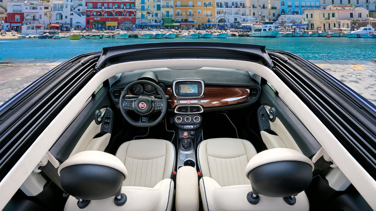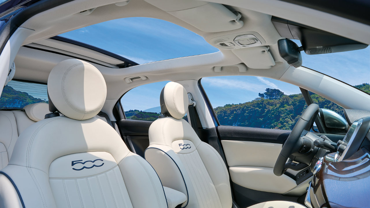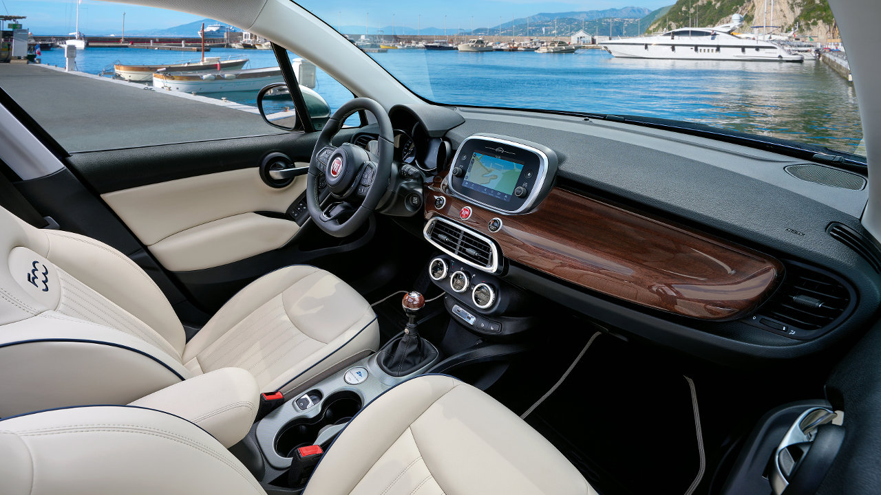 Στο εσωτερικό η αίσθηση γίνεται ακόμα πιο έντονη χάρη στην επιλογή ξύλου στο ταμπλό, το οποίο έχει επεξεργαστεί με ειδικές τεχνικές ώστε εκτός από εξαιρετικά όμορφο να είναι επίσης ανθεκτικό και να μην δημιουργεί ανεπιθύμητες αντανακλάσεις. Τέλος τα πολυτελή δερμάτινα καθίσματα με τις μπλε ραφές και τα ειδικά λογότυπα που συνοδεύουν την έκδοση ολοκληρώνουν την εικόνα αυτού του ξεχωριστού 500Χ.