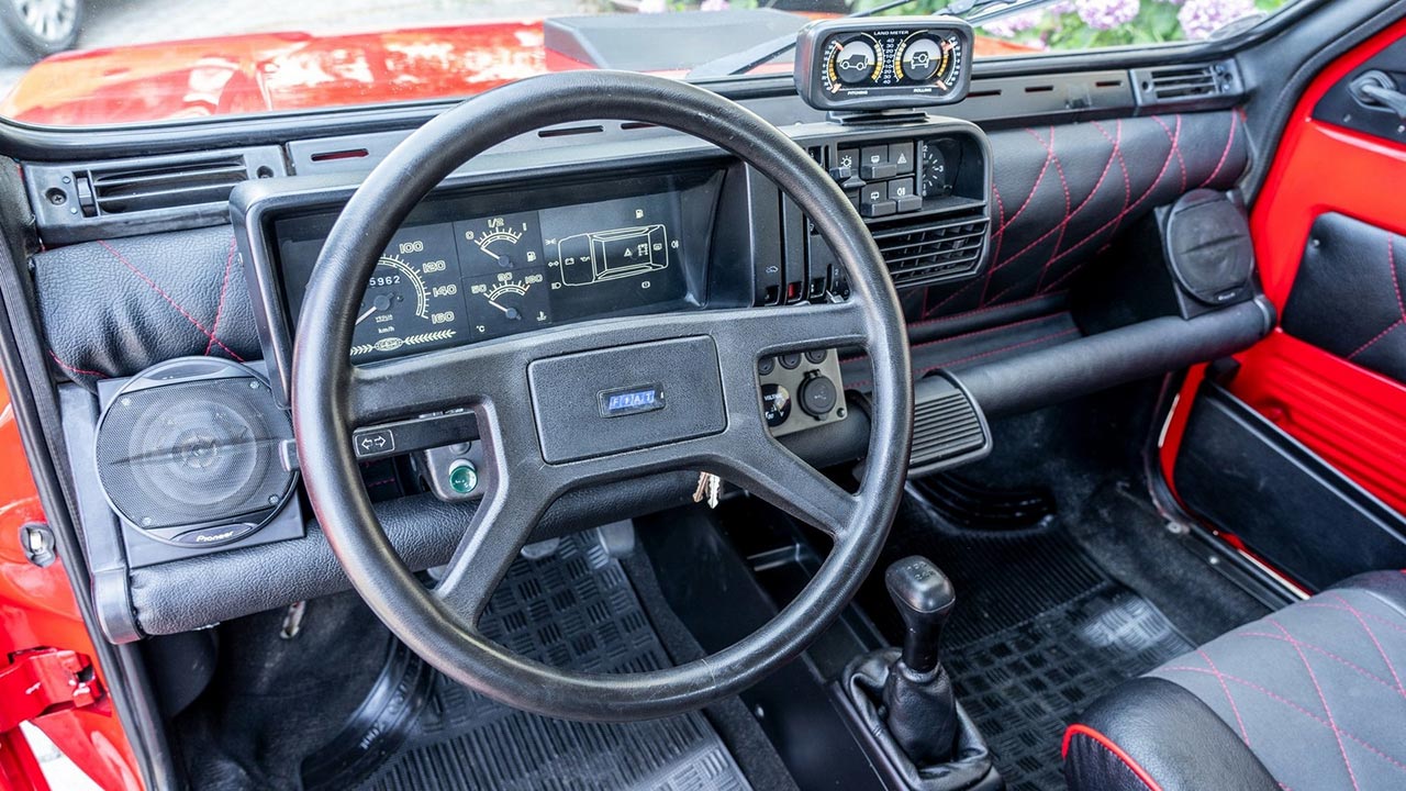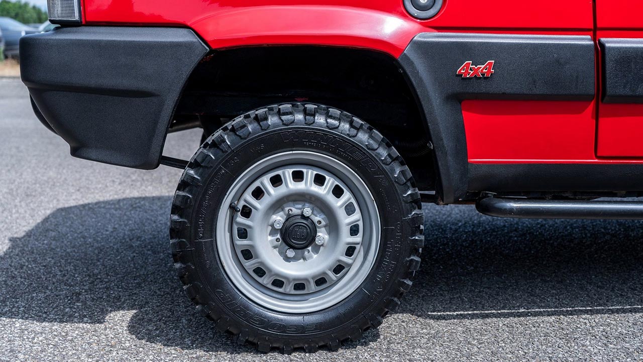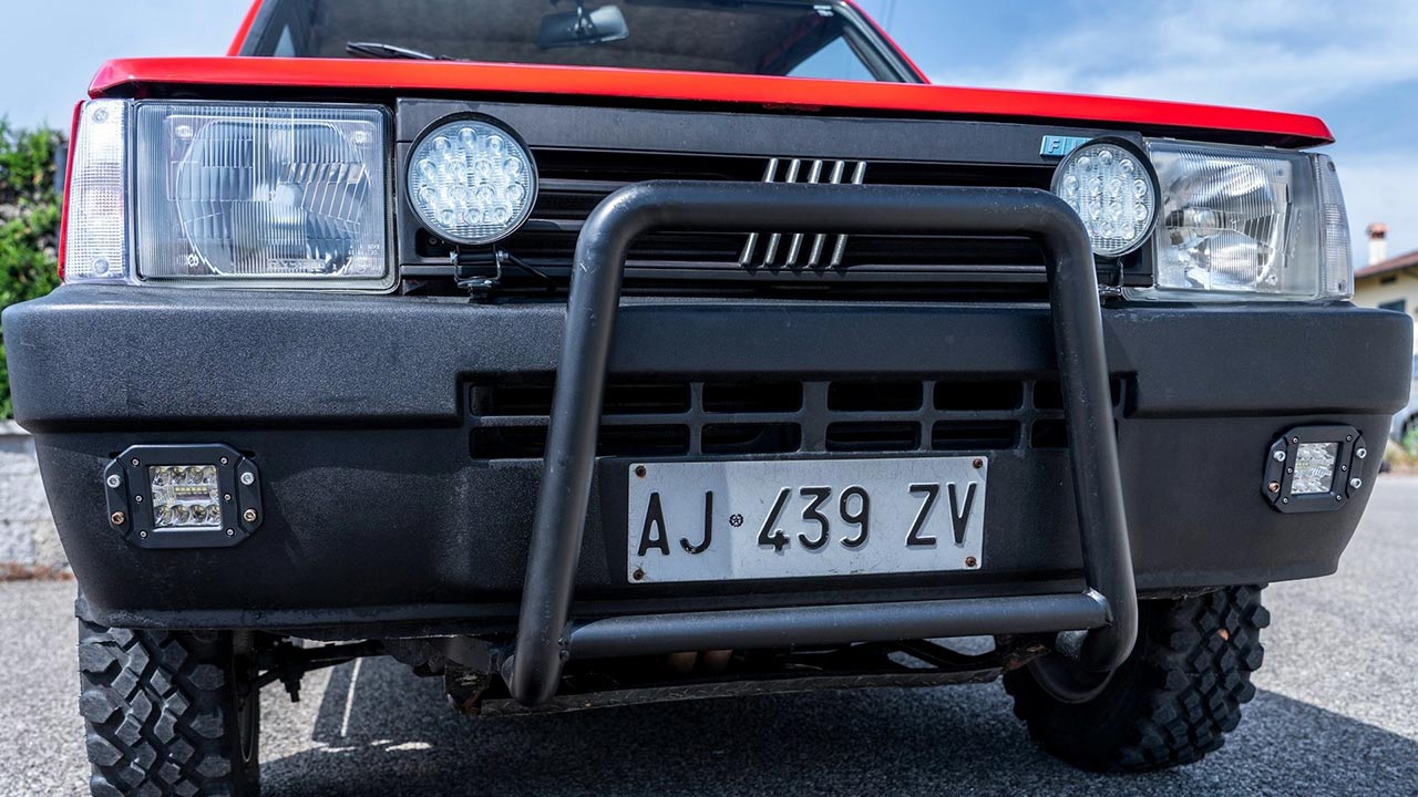 Πάμε στο τώρα όμως, όπου το εικονιζόμενο και ανακατασκευασμένο Fiat Panda 4×4 είναι κατασκευής 1986. Το μοντέλο αυτό είχε φτιαχτεί ξανά και είχε δημοπρατηθεί ακόμα μια φορά από την CataWiki. Το αμάξωμα βάφτηκε όλο στο εργοστασιακό κόκκινο χρώμα και αντικαταστάθηκαν όλα τα πλαστικά του. Επιπλέον αλλάχτηκαν και οι τροχοί, όπου και φορέθηκαν 13άρες σιδερένιες ζάντες με off road ελαστικά. Εντυπωσιακό είναι το bull bar που έχει τοποθετηθεί, όπως επίσης και οι ράγες οροφής.