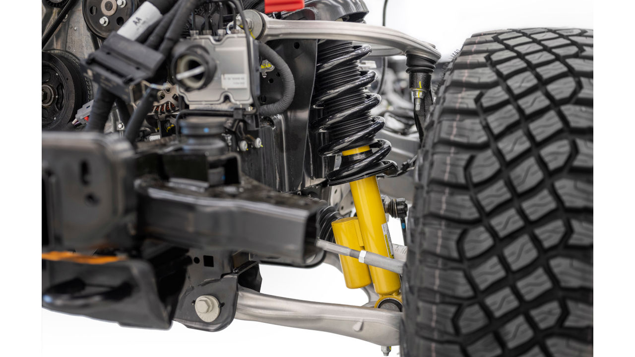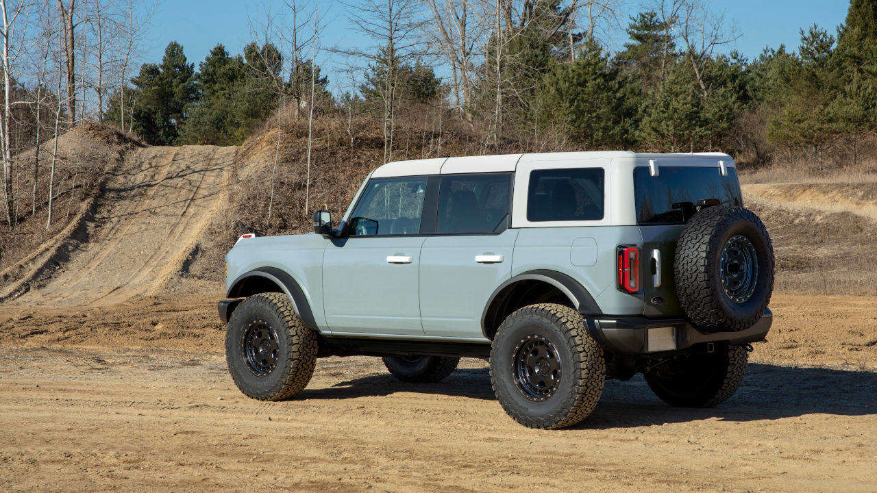 Όλα τα Bronco προσφέρονται με δύο διαφορετικά συστήματα 4κίνησης και τα δύο με κοντές σχέσεις, το πρώτο πιο βασικό και το δεύτερο πιο εξελιγμένο, για να καλύπτει και τους πιο απαιτητικούς χρήστες. Η πιο εξελιγμένη μάλιστα φέρει επτά διαφορετικά προφίλ οδήγησης, εκ των οποίων τα τέσσερα προορίζονται για εκτός δρόμου κίνηση σε λάσπη, άμμο ή πέτρες. Ο πίσω άκαμπτος άξονας με τους πέντε συνδέσμους είναι ένας Dana 44 AdvanTEK ενώ και η εμπρός ανεξάρτητη ανάρτηση-μετάδοση είναι επίσης Dana AdvanTEK. Και τα δύο είναι διαθέσιμα με Spicer Performa-TraK διαφορικά που κλειδώνουν ηλεκτρονικά. Τα ρυθμιζόμενα αμορτισέρ με τις μεγάλες διαδρομές προέρχονται από την Bilstein. Για πρώτη φορά στην κατηγορία θα προσφέρονται από το εργοστάσιο οι τροχοί των 35 ιντσών που βλέπετε και στις φωτογραφίες, ανεξάρτητα από το επίπεδο εξοπλισμού των 2θυρών και 4θυρών Bronco.
