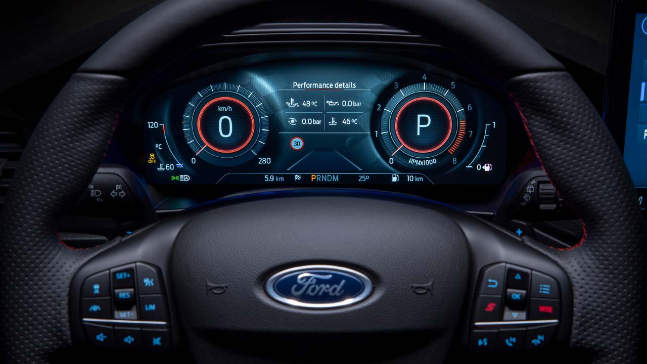 Στο εσωτερικό το ανανεωμένο Ford Focus ενσωματώνει τις τελευταίες τεχνολογίες άνεσης και οδήγησης της μάρκας για μια πιο άνετη και συνδεδεμένη οδηγική εμπειρία, όπως λέει η ίδια. Διαθέτει το νέο σύστημα επικοινωνίας και ψυχαγωγίας SYNC 4, το οποίο χρησιμοποιεί έναν εξελιγμένο αλγόριθμο μηχανικής μάθησης για να μάθει από τη συμπεριφορά του οδηγού και να παρέχει ακριβέστερες προτάσεις και αποτελέσματα αναζήτησης με την πάροδο του χρόνου. Το SYNC 4 υποστηρίζεται από μια ολοκαίνουργια κεντρική οθόνη αφής 13,2 ιντσών, με μια διαισθητική διεπαφή που σημαίνει ότι οι οδηγοί δεν απέχουν ποτέ περισσότερο από ένα άγγιγμα από οποιαδήποτε εφαρμογή, πληροφορίες ή έλεγχο που χρειάζονται. Η νέα οθόνη αφής ενσωματώνει επίσης χειριστήρια για λειτουργίες όπως η θέρμανση και ο εξαερισμός, ενώ διαθέτει επίσης ασύρματη συμβατότητα Apple CarPlay και Android Auto, επιτρέποντας την απρόσκοπτη ενσωμάτωση μεταξύ των λειτουργιών smartphone και του SYNC 4. Επίσης διαθέτει αναγνώριση ομιλίας που επιτρέπει στους επιβάτες να χρησιμοποιούν τη φυσική ομιλία σε 15 ευρωπαϊκές γλώσσες. Φυσικά δεν μπορούμε να μην αναφερθούμε και στο ψηφιακό πάνελ που έχει πάρει την θέση του πίνακα οργάνων και διαθέτει νέα γραφικά και δυνατότητες εξατομίκευσης.