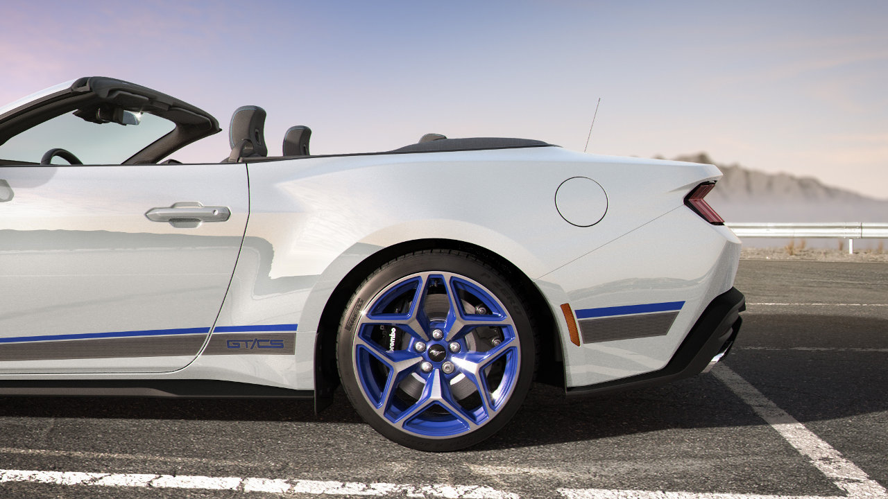 Οι λωρίδες φέρουν μία μοναδική επιγραφή GT/CS που είναι σχεδόν αόρατη σε χαμηλό φωτισμό, αλλά γίνεται πολύ πιο εμφανής στο φως του ήλιου. Μαύρα πλαίσια κοσμούν τους προβολείς, ενώ οι ζάντες αλουμινίου 19 ιντσών διαθέτουν κατεργασμένη επιφάνεια με λεπτομέρειες Rave Blue, που συμπληρώνονται από ένα σήμα GT/CS στην εμπρός μάσκα και ένα λογότυπο GT στο πορτμπαγκάζ, αμφότερα στο ίδιο χρώμα.