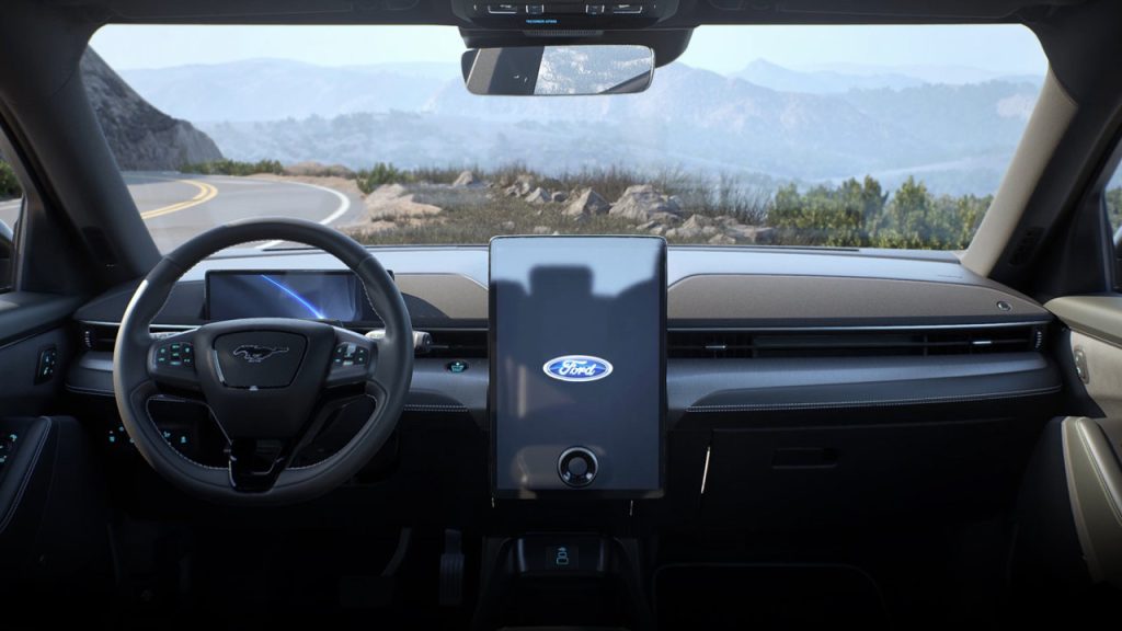 Στο εσωτερικό της, η Mustang Mach-E προσφέρει μια ολοκληρωμένη ψηφιακή εμπειρία που καθιστά την οδήγηση διαισθητική. Πίσω από το σπορ τιμόνι βρίσκεται ένας ψηφιακός πίνακας οργάνων 10,2 ιντσών που προβάλει ένα πλήθος από χρήσιμες πληροφορίες, ενώ η οθόνη του συστήματος πολυμέσων με κατακόρυφο προσανατολισμό και διαγώνιο 15,5 ιντσών είναι εγκατεστημένη στο κέντρο του ταμπλό υποστηριζόμενη από το προηγμένο σύστημα SYNC 4Α της Ford.