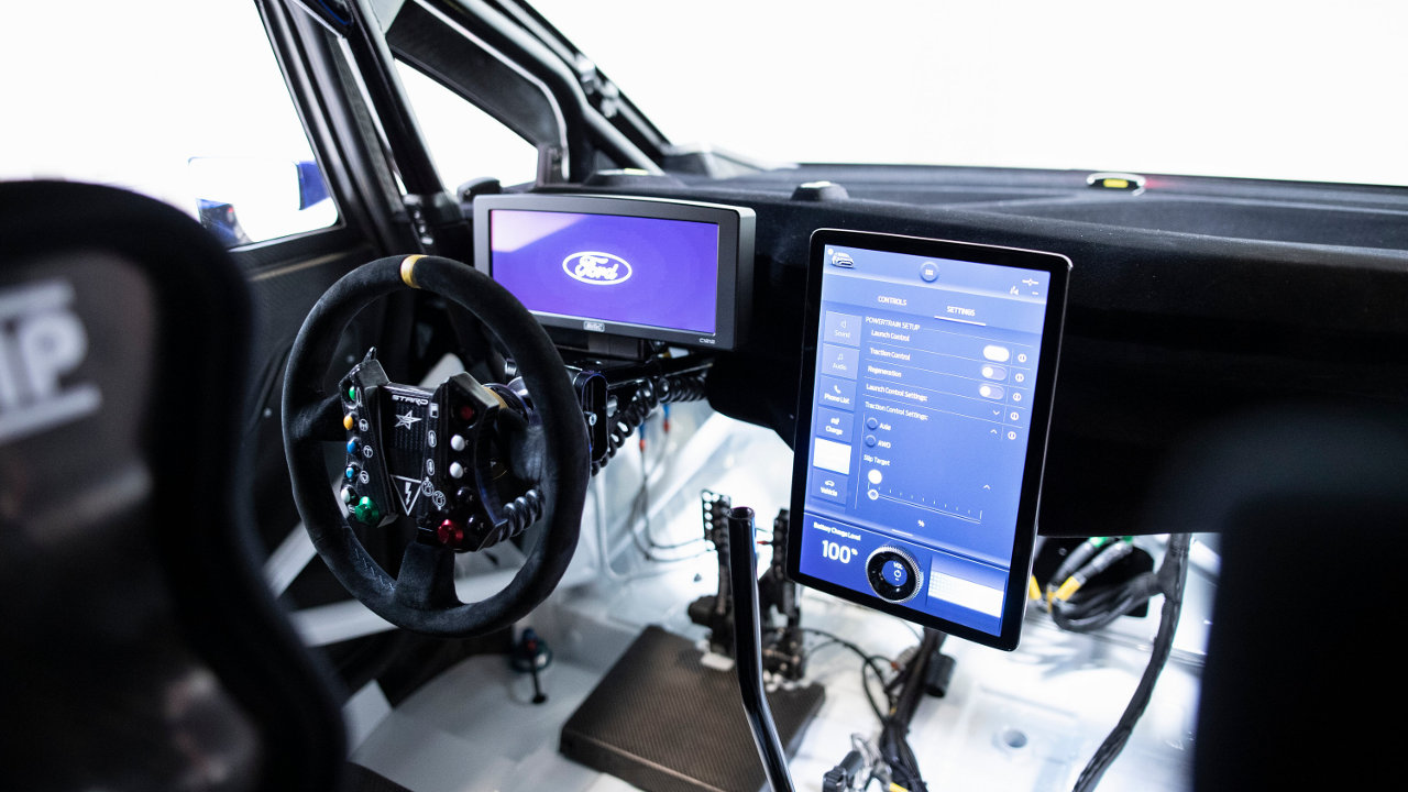 Το εσωτερικό του Ford Pro Electric SuperVan περιλαμβάνει ένα πλήρες roll cage και αγωνιστικά καθίσματα σύμφωνα με τα πρότυπα ασφάλειας της FIA, καθώς και μια μεγάλη οθόνη αφής SYNC που προέρχεται από τα οχήματα παραγωγής της Ford – όπως η Ford Mustang Mach-E 6 – που ελέγχει τα προηγμένα συστήματα συνδεσιμότητας και πληροφοριών. Εάν απαιτείται, οι οδηγοί του Electric SuperVan μπορούν να κάνουν ένα διάλειμμα μένοντας για λίγο μακριά από αναβάσεις και πίστες, προκειμένου να σχεδιάσουν μια διαδρομή, να βρουν φορτιστή, να συνδεθούν στο WiFi και να πραγματοποιήσουν τηλεφωνικές κλήσεις – όλα αυτά μέσω της οθόνης SYNC.