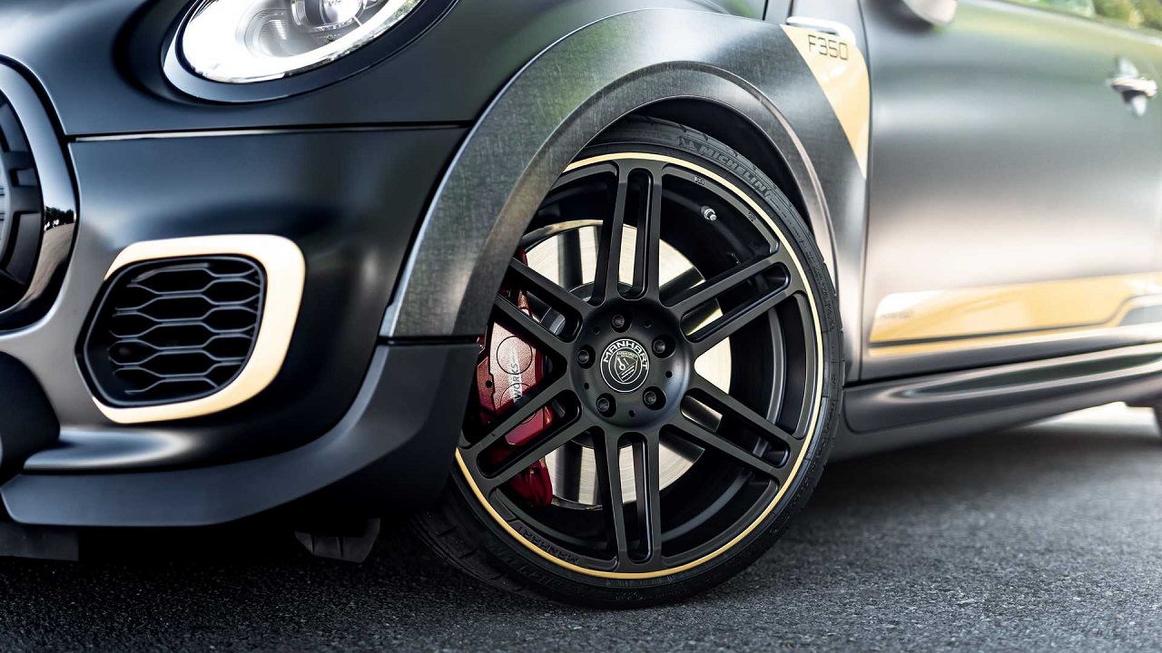 Επιπλέον, υπάρχει ένα κιτ ανάρτησης του μειώνει την απόσταση από το έδαφος κατά 20 χιλιοστά εμπρός και 15 πίσω. Οι ζάντες του Mini JCW GP είναι επίσης έργο του γερμανικού οίκου και ονομάζονται Manhart Concave One, ενώ τα ελαστικά είναι μεγέθους 235/30 ZR19.