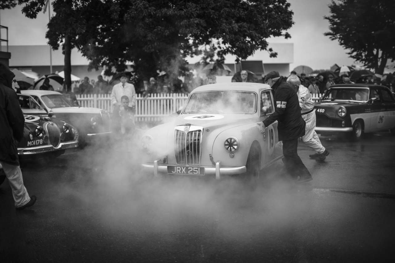 Ο καιρός, κλασικά βρετανικής φιλοσοφίας, με ηλιοφάνεια τη μια στιγμή και ξαφνικές νεροποντές την άλλη, που μετατρέπουν σε ατέλειωτους λασπότοπους τα λιβάδια που περιβάλλουν το Goodwood και χρησιμοποιούνται για πάρκινγκ, καταστρέφοντας πανάκριβες ενδυματολογικές επιλογές αλλά και εκπληκτικές γόβες Tweed όλων των χρωματικών αποχρώσεων. Στην πίστα τα πράγματα δεν ήταν καλύτερα, αφού σε άλλα σημεία το νερό λίμναζε δημιουργώντας επικίνδυνες παγίδες για υδρολίσθηση κι αλλού θύμιζε παγοδρόμιο, με οδηγούς και αναβάτες να στραγγαλίζουν κάθε ίχνος πρόσφυσης που έβρισκαν διαθέσιμη. Τόσο όμως οι επισκέπτες όσο και οι αγωνιζόμενοι δεν έδειξαν να πτοούνται από την ιδιοτροπία του καιρού και τις συνεχείς εναλλαγές του. Άλλωστε συνηθισμένοι είναι.