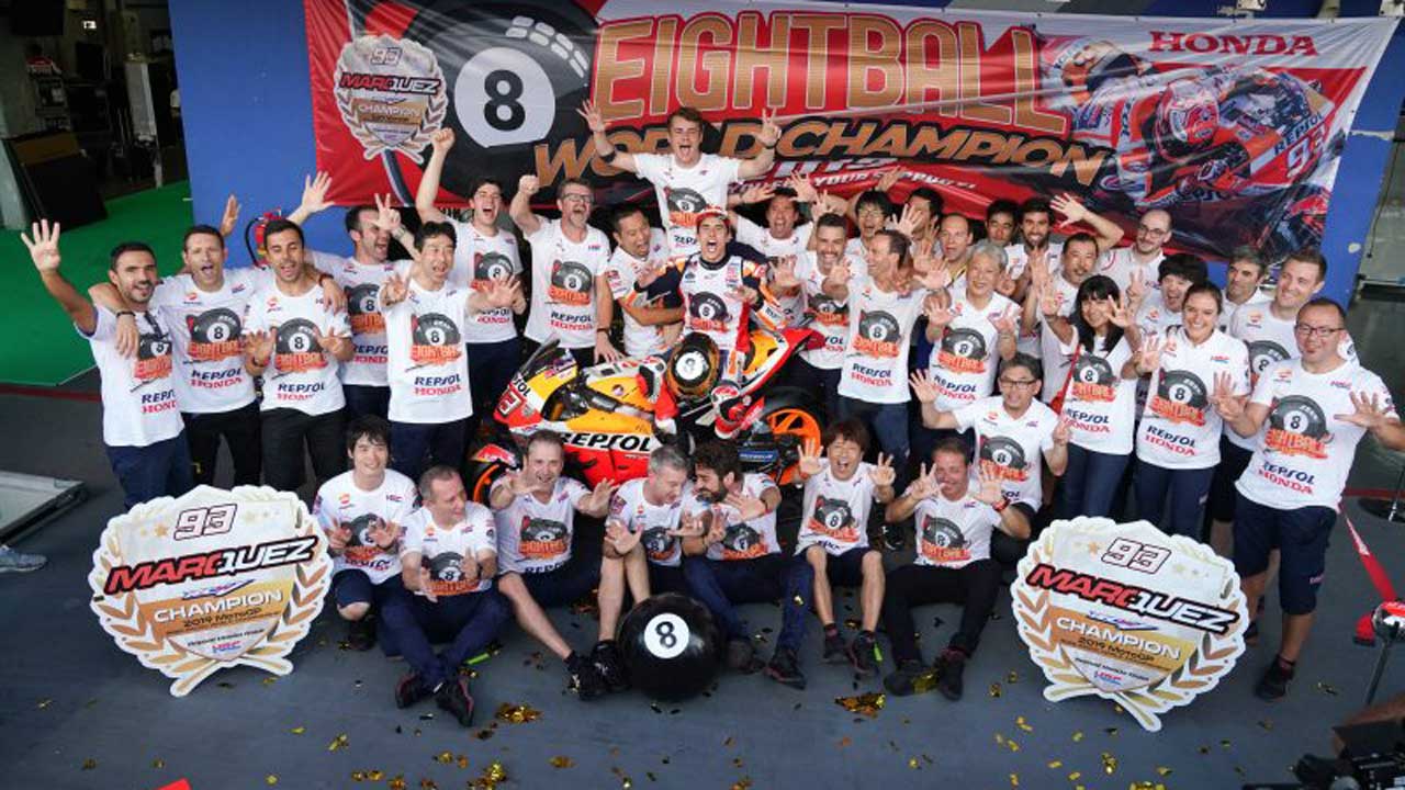 Με 325 βαθμούς, 9 νίκες, 14 τερματισμούς στο βάθρο, 9 pole position και 10 ταχύτερους γύρους σε αγώνες, ο Marc Marquez στέφεται Παγκόσμιος Πρωταθλητής με τα χρώματα της ομάδας Repsol Honda για έκτη φορά και συνολικά για όγδοη στην καριέρα του. Αυτή η νίκη σηματοδοτεί επίσης την 150ή για την Honda στο MotoGP – επίδοση που δεν έχει καταφέρει μέχρι και σήμερα κανένας άλλος κατασκευαστής.