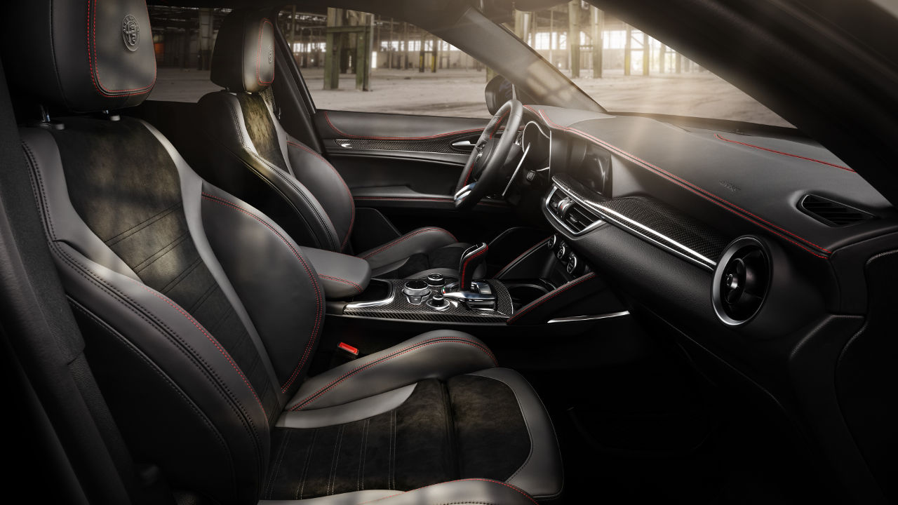 Στο εσωτερικό βλέπουμε τα εξαιρετικά σπορ καθίσματα της Giulia Veloce Ti, με επενδύσεις από δέρμα και Alcantara, μαύρη επένδυση για την οροφή αλλά και μεγάλες δόσεις ανθρακονημάτων στην κεντρική κονσόλα, το ταμπλό και τις πόρτες. Το “παρών” δίνουν και τα μεγάλα αλουμινένια paddles πίσω από το τιμόνι, για τον χειροκίνητο έλεγχο του αυτόματου κιβωτίου των 8 σχέσεων.