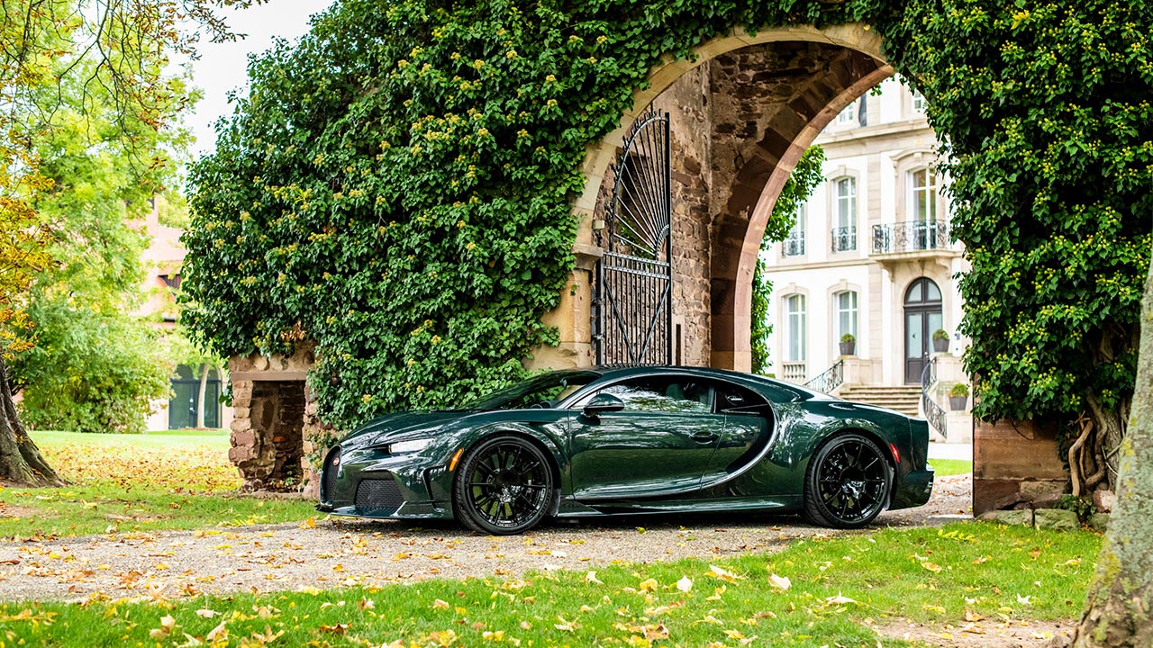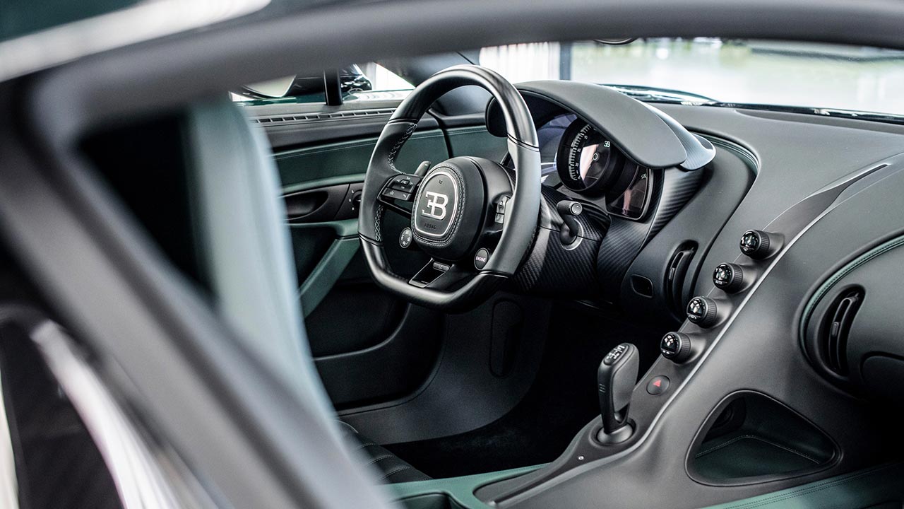 Το σκούρο πράσινο χρώμα του αμαξώματος που επέλεξε ο ιδιοκτήτης της εν λόγω Chiron, ταιριάζει αρμονικά με τις γρίλιες του εμπρόσθιου προφυλακτήρα, αλλά και με τα καπάκια των ζαντών μαγνησίου. Το εσωτερικό είναι ντυμένο με δέρμα, σαφώς σε τόνους πράσινου, με έντονες δόσεις beluga black χρώματος. Εκτός των άλλων, εντύπωση προκαλεί και η γυάλινη πανοραμική οροφή.