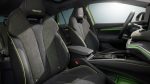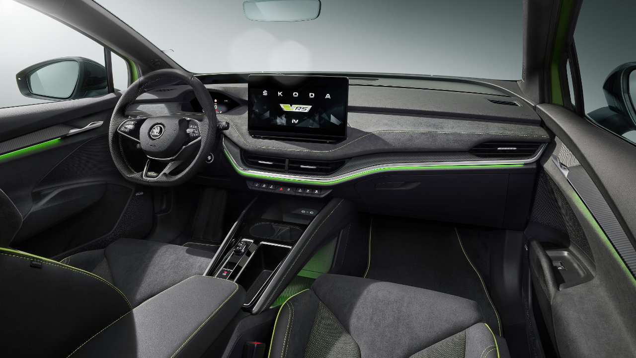 Τα διακριτικά RS συμπληρώνουν τις εξωτερικές αλλαγές στο νέο Enyaq RS και δίνουν το “παρών” στην καμπίνα που δεν διαφοροποιείτα επί της ουσίας ένατι της Coupe έκδοσης. Οι επενδύσεις είναι τύπου suede για τα σπορ καθίσματα και το ταμπλό, ενώ carbon look φιλέτα κοσμούν τόσο το ταμπλό όσο και τις πόρτες.