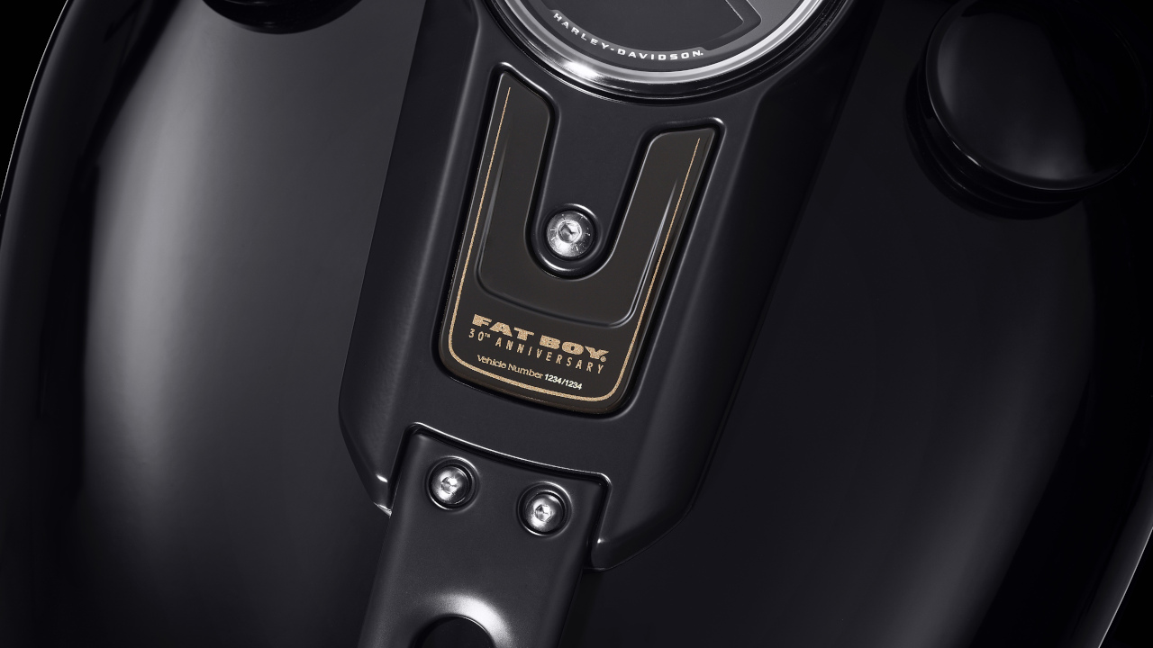 Το μαύρο επικρατεί στο περίβλημα του προβολέα, το τιμόνι και τα χειριστήρια τονίζοντας τη σκοτεινή συνολική εμφάνιση και διαφοροποιεί τη συλλεκτική έκδοση από τη στάνταρ έκδοση. Νέο είναι και το λογότυπο Fat Boy στο ρεζερβουάρ, το οποίο, μαζί με τις υπόλοιπες μπρονζέ λεπτομέρειες κάνουν το Fat Boy 30th Anniversary να ξεχωρίζει από το αρχικό μοντέλο των 90s.