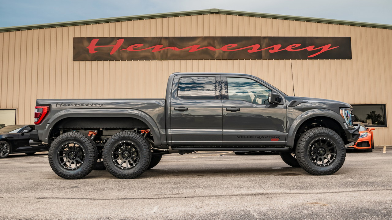 Ξεκινώντας από την εξωτερική εμφάνιση, στο εμπρός τμήμα του Hennessey Velociraptor 6×6 βλέπουμε την μεταλλική ποδιά, αλλά και μία μπαριέρα. Η πιο εντυπωσιακή όψη, βέβαια, είναι η πλαϊνή, μιας και βλέπουμε τους τρεις άξονες (όλοι κινητήριοι) και τους τεράστιους τροχούς των 37 ιντσών (μαζί με τα χωμάτινα ελαστικά). Η επιβλητική εικόνα ολοκληρώνεται με τις δύο απολήξεις της εξάτμισης εκατέρωθεν, αλλά και με την μεγάλη απόσταση από το έδαφος που εξασφαλίζει η ρυθμιζόμενη ανάρτηση της FOX.