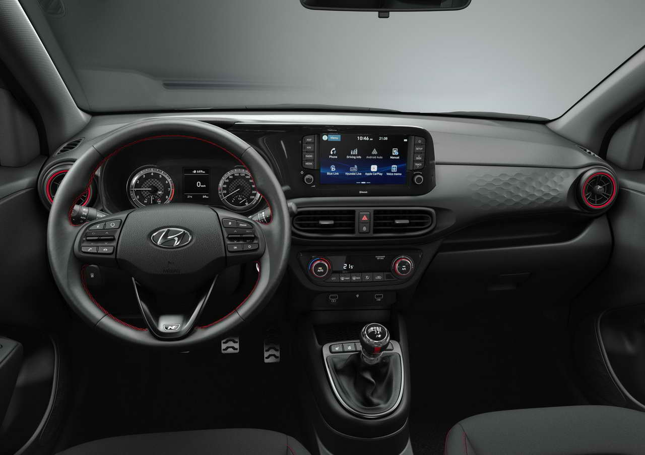 Ανάλογη η εικόνα και στο εσωτερικό του Hyundai i10 N Line, με λεπτομέρειες που είναι εμπνευσμένες από την εμπλοκή της μάρκας στους αγώνες. Το τιμόνι και ο λεβιές ταχυτήτων διαθέτουν το χαρακτηριστικό λογότυπο Ν. Ενδεικτικά της σπορ εικόνας είναι τα μεταλλικά πεντάλ, οι αεραγωγοί σε κόκκινο χρώμα και τα σπορ καθίσματα.