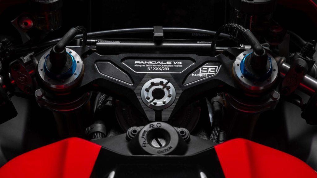 Μεταξύ των πολλών λεπτομερειών που κάνουν τη συγκεκριμένη έκδοση να ξεχωρίζει είναι και το ανοιχτό carbon καπάκι του συμπλέκτη το GPS module τηλεμετρίας, η επένδυση Alcantara για τη σέλα και τα ειδικά γραφικά έναρξης της TFT οθόνης. Επίσης στην πλάκα του τιμονιού αναγράφεται το όνομα της ειδικής έκδοσης και ο αύξοντας αριθμός παραγωγής, ενώ η μοτοσυκλέτα συνοδεύεται από πιστοποιητικό γνησιότητας ειδική κουκούλα αλλά και ειδικό κουτί! Δεν λείπει φυσικά η υπογραφή του Marc Marquez στο ρεζερβουάρ της, την οποία έχει βάλει ο ίδιος ο Ισπανός.