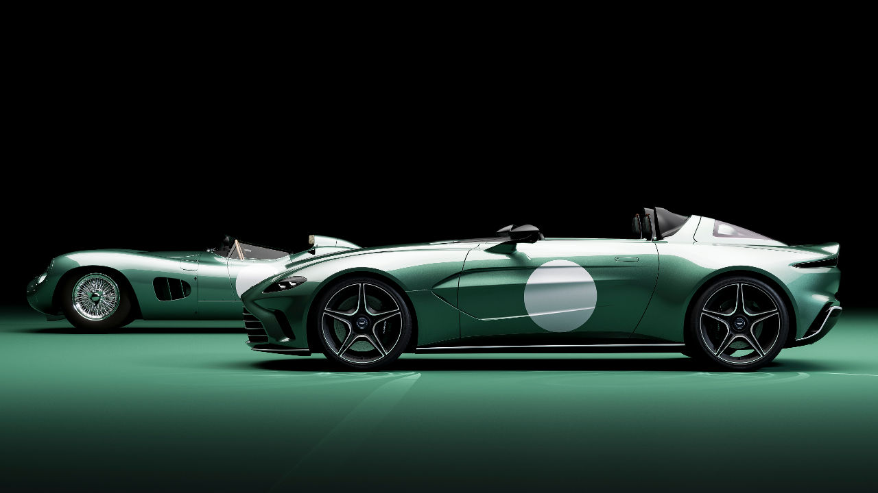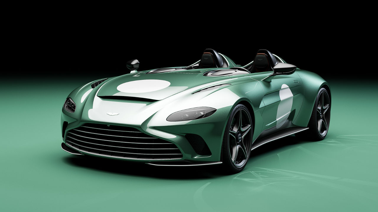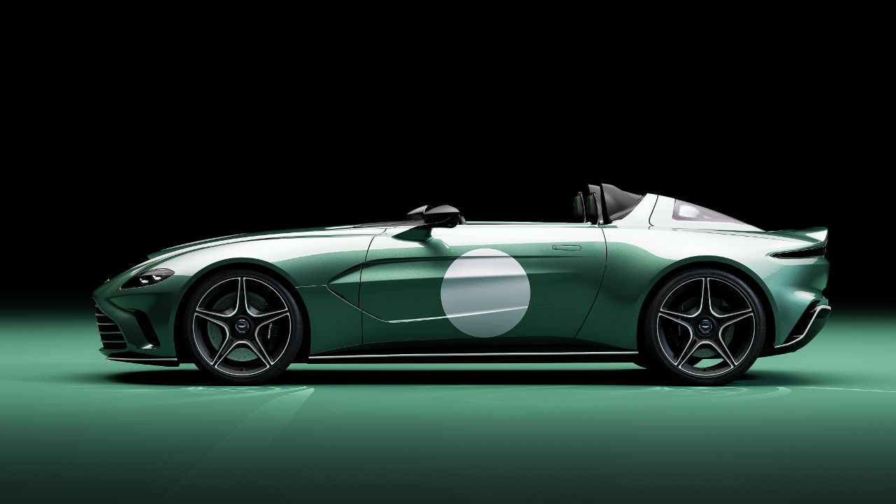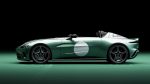 Η κληρονομία της DBR1 στη νέα έκδοση της Aston Martin V12 Speedster φαίνεται εξωτερικά από το πράσινο χρώμα (Aston Martin Racing Green), τις λευκές λωρίδες αλλά και τους ομόχρωμους κύκλους στις πόρτες έτοιμους να “δεχτούν” νούμερα συμμετοχής.