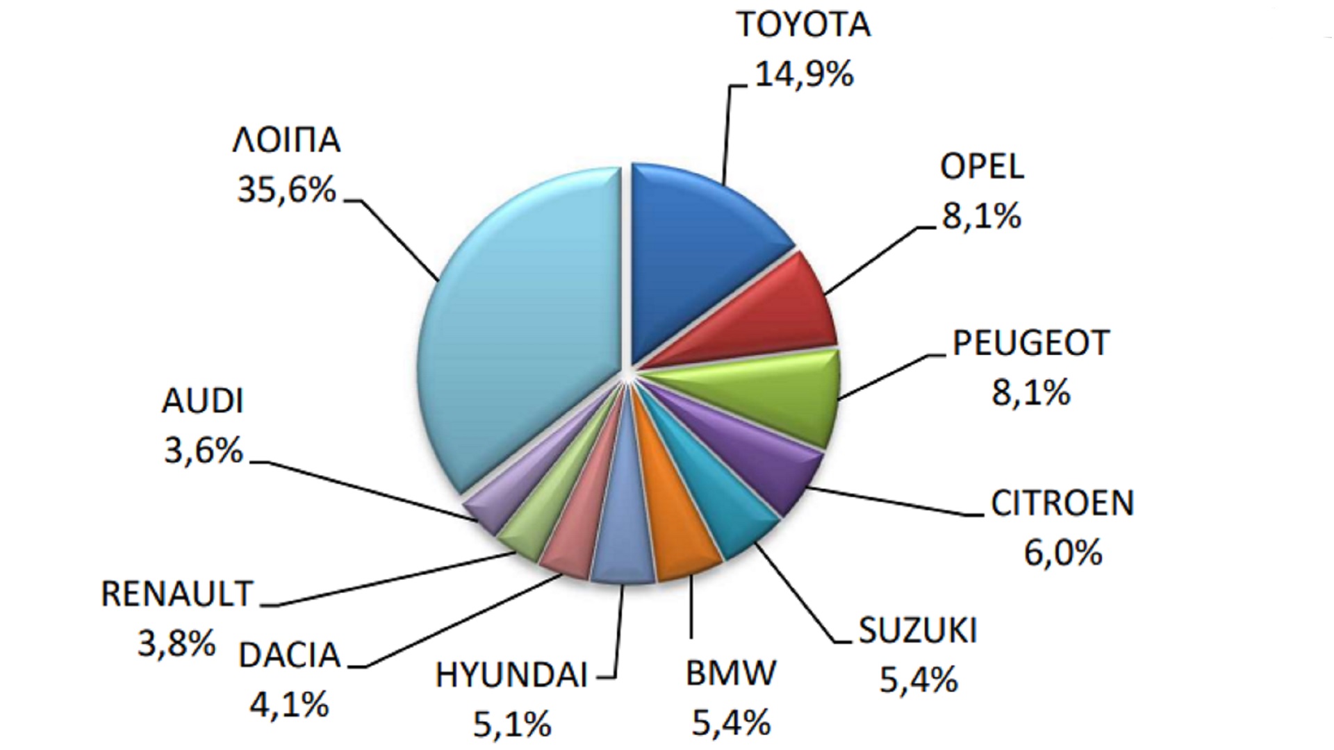 Η Toyota είναι η best seller μάρκα καταγράφοντας μερίδιο αγοράς 14,9%. Πίσω της ακολουθεί η Opel με 8,1%, ενώ η πρώτη τριάδα συμπληρώνεται από την Peugeot που καταγράφει ακριβώς το ίδιο ποσοστό 8,1% (έχουν διαφορά μόλις ελάχιστων αυτοκινήτων). Η ΕΛΣΤΑΤ έχει δημοσιεύσει σχετικό γράφημα, όπου μπορείτε να δείτε τις δέκα πιο δημοφιλείς μάρκες του πρώτου διμήνου στην ελληνική αγορά. Είναι αυτό που βλέπετε στην παρακάτω εικόνα.