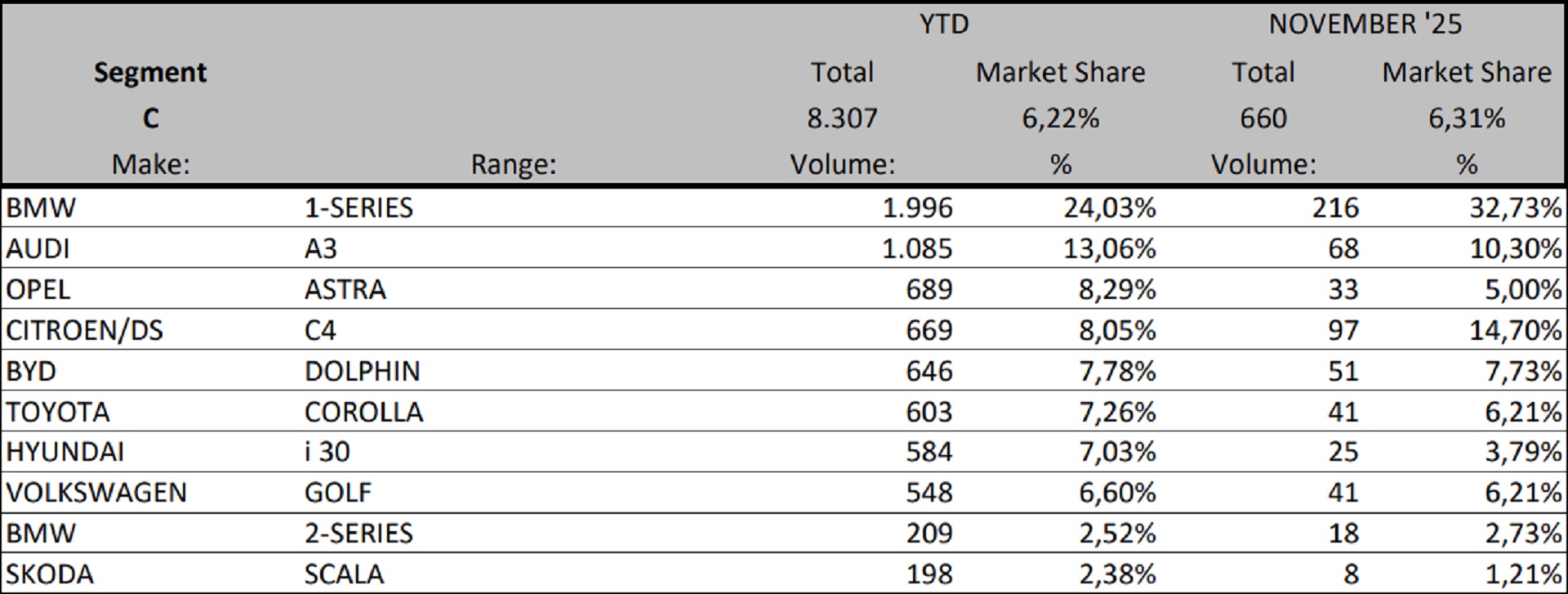 Με 1.996 ταξινομήσεις μέσα στο 11μηνο του 2025, η BMW Σειρά 1 έχει “κλειδώσει” την πρώτη θέση στην κατηγορία των μικρομεσαίων οικογενειακών (C-Segment). Η επίδοσή της είναι εντυπωσιακή, ειδικά αν αναλογιστεί κανείς ότι σε αυτή την κατηγορία υπάρχουν πολλές δημοφιλείς επιλογές, όπως το VW Golf, το Toyota Corolla και το Opel Astra.