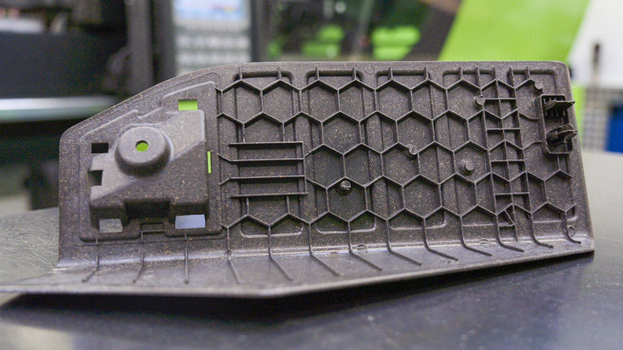 Αποτελούμενη κατά 40% από ίνες και κατά 60% από ανακυκλωμένο πλαστικό πολυπροπυλενίου, η ουσία που προέκυψε θερμάνθηκε και μορφοποιήθηκε με έγχυση στο σχήμα του επιλεγμένου εξαρτήματος.