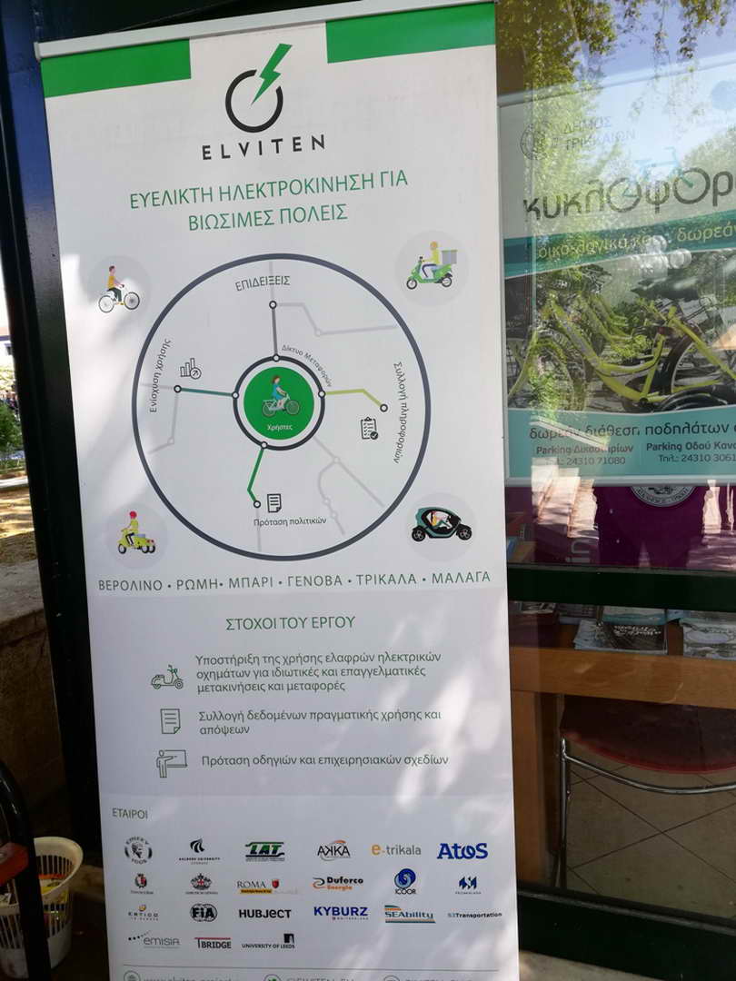 Στόχος του συγκεκριμένου προγράμματος είναι η ενεργή συμμετοχή στην αλλαγή της κινητικότητας (mobility) των πόλεων. Επιπλέον, οι πολίτες αποκτούν την ευκαιρία να εξοικειωθούν με την ηλεκτροκίνηση, μια τεχνολογία που αναπτύσσεται με ραγδαίους ρυθμούς από την παγκόσμια αυτοκινητοβιομηχανία. Μέσω του ELVITEN, προωθείται η χρήση ελαφρών ηλεκτρικών οχημάτων (ποδήλατα, σκούτερ, τρίκυκλα, τετράκυκλα) για αστική χρήση. Στα Τρίκαλα θα υπάρχουν 5 οχήματα, που θα προσφέρονται στους πολίτες για περιηγήσεις ή καθημερινές δουλειά στην πόλη. Τα 3 εξ αυτών βρίσκονται ήδη στο Κέντρο Πληροφόρησης (InfoPoint) στην Πλατεία Ηρώων Πολυτεχνείου, ενώ άλλα 2 θα βρεθούν στον Μύλο Ματσόπουλου. Επιπλέον, έχουν ήδη δοθεί 5 τρίκυκλα, για χρήση από επαγγελματίες της πόλης.