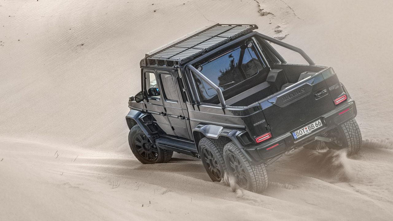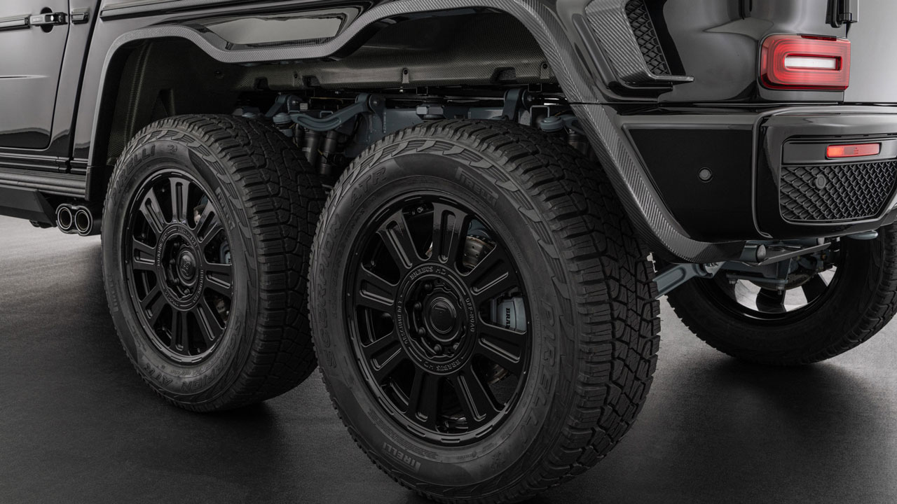 Ξεκινώντας από την εξωτερική εικόνα, βλέπουμε πως υπάρχουν τα σήματα της Brabus εμπρός, πίσω και στις ζάντες BRABUS Monoblock HD μεγέθους 22 ιντσών. Η απόσταση από το έδαφος έχει εκτοξευθεί στα 47,3 εκατοστά, ενώ στην οροφή υπάρχουν και μπάρες LED για καλό φωτισμό και στις πιο σκοτεινές διαδρομές. Στο πίσω μέρος, βλέπουμε τον χώρο αποθήκευσης, αλλά και τις μπάρες οροφής για ακαμψία αντάξια των SUV.