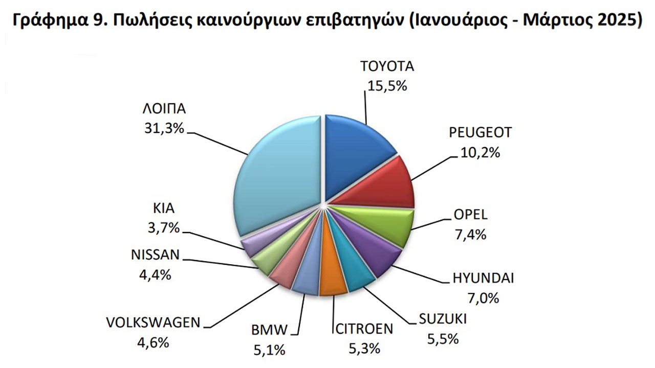 Πίσω της, στη δεύτερη θέση βρέθηκε η Peugeot με 3.391 ταξινομήσεις, αριθμός που μεταφράζεται σε 10,2% της αγοράς. Η πρώτη τριάδα ολοκληρώνεται με την Opel, των 2.444 ταξινομήσεων με μερίδιο 7,4%. Υπενθυμίζουμε κάπου εδώ ότι η Opel ξεκίνησε πολύ δυνατά μέσα στο 2025. Μάλιστα, στο πρώτο δίμηνο, το Opel Corsa είχε περάσει το άκρως δημοφιλές Toyota Yaris (δείτε εδώ πιο αναλυτικά), ενώ πρωτιά έχει και στην κατηγορία των μικρομεσαίων οικογενειακών με το Opel Astra (στο πρώτο δίμηνο του 2024).