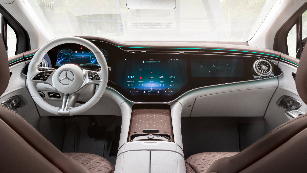 Με την οθόνη MBUX Hyperscreen, τρεις οθόνες ενσωματώνονται αρμονικά σε μία δημιουργώντας μία ενιαία ζώνη πλάτους άνω των 141 εκατοστών. Ο συνοδηγός της EQE SUV έχει την επιλογή μιας οθόνης OLED 12,3 ιντσών με τη δική της διεπαφή χρήστη. Το σύστημα χρησιμοποιεί μια ευφυή λογική κλειδώματος βασισμένη σε κάμερα, η οποία αντιλαμβάνεται εάν ο οδηγός κοιτάζει την οθόνη συνοδηγού. Σε αυτή την περίπτωση, το σύστημα αυτομάτως μειώνει την ένταση του φωτισμού της οθόνης για λόγους ασφάλειας.