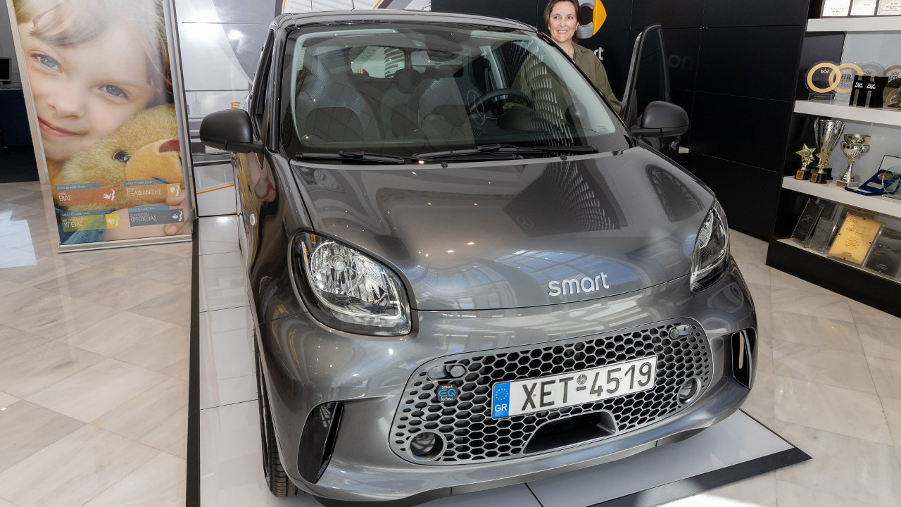 Η κα Αγγελική Προδρομίδη με μόλις 5 λαχνούς ήταν η μεγάλη νικήτρια που κέρδισε το πρώτο δώρο της λαχειοφόρου, το τετράπορτο, τετραθέσιο αμιγώς ηλεκτρικό και ιδανικό για τις μετακινήσεις στην πόλη smart forfour EQ.